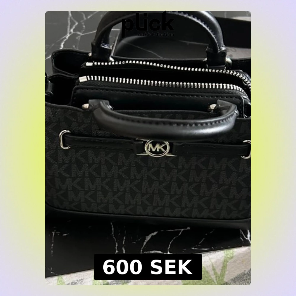 Snygg svart handväska från Michael Kors med klassiskt MK-mönster över hela väskan. Väskan har dubbla handtag, silverfärgade detaljer och dragkedjor samt en avtagbar axelrem. Tillverkad i skinn och syntetmaterial för en lyxig känsla.
