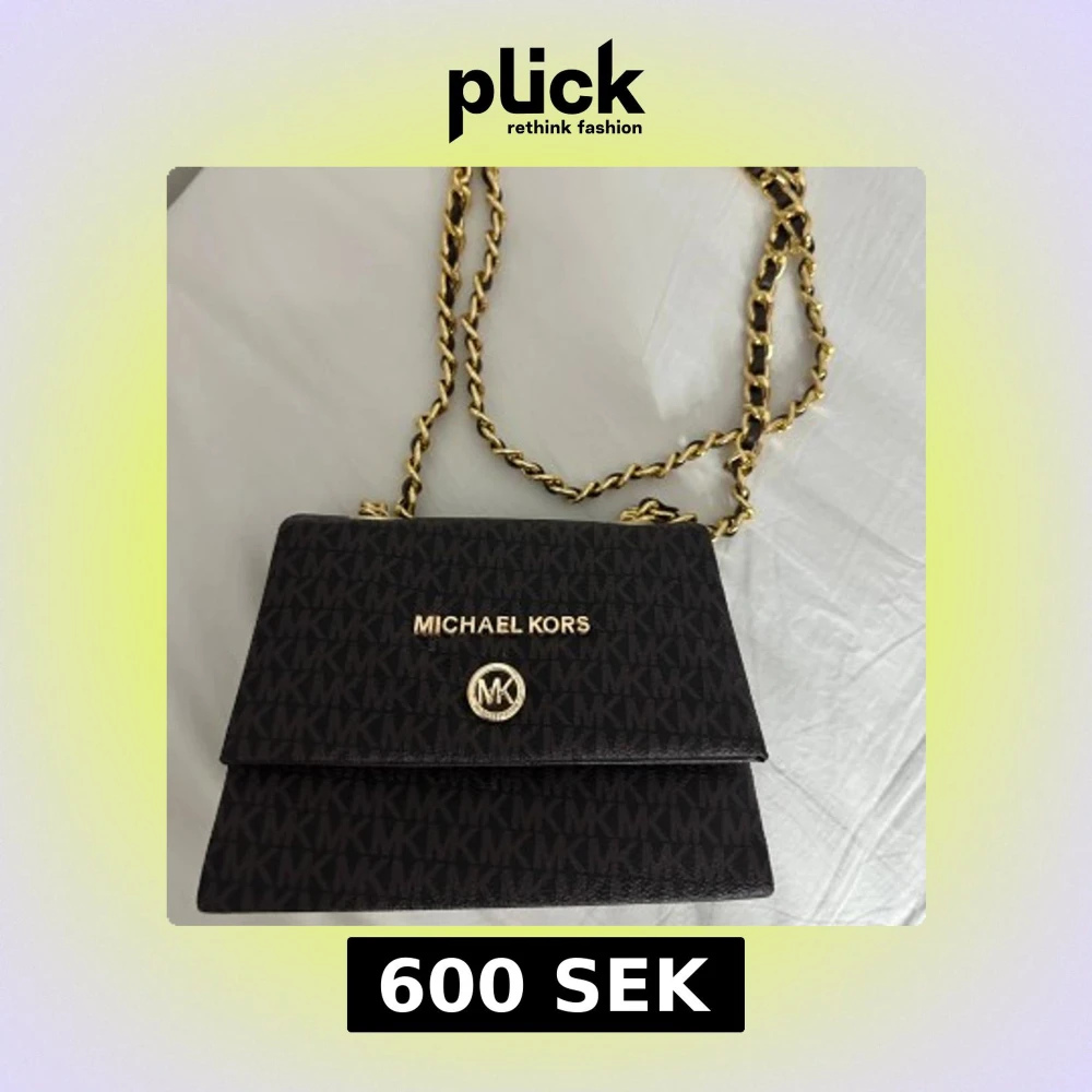 Snygg svart axelväska från Michael Kors med guldiga kedjedetaljer och logomönster över hela väskan. Väskan har ett lock med magnetlås och rymligt fack inuti. Perfekt för dig som vill ha en stilren och trendig accessoar. Aldrig använt