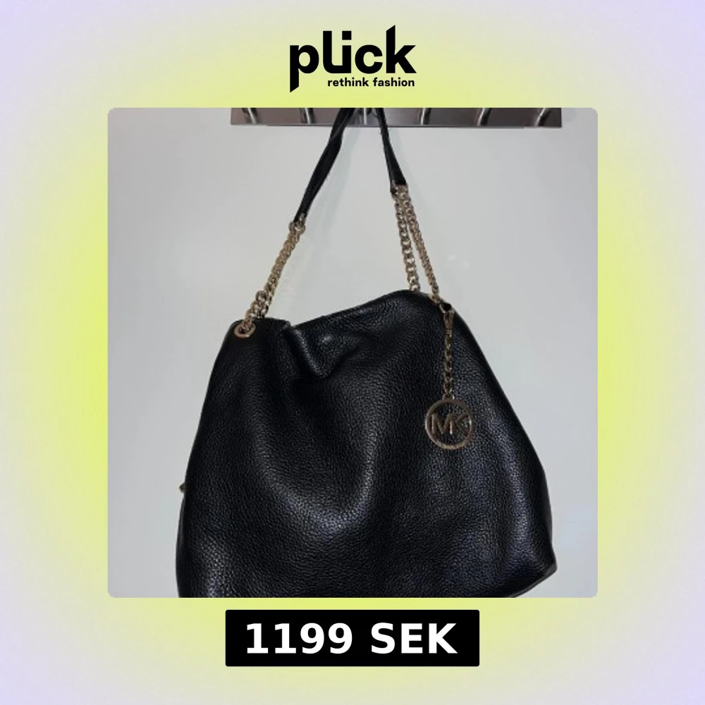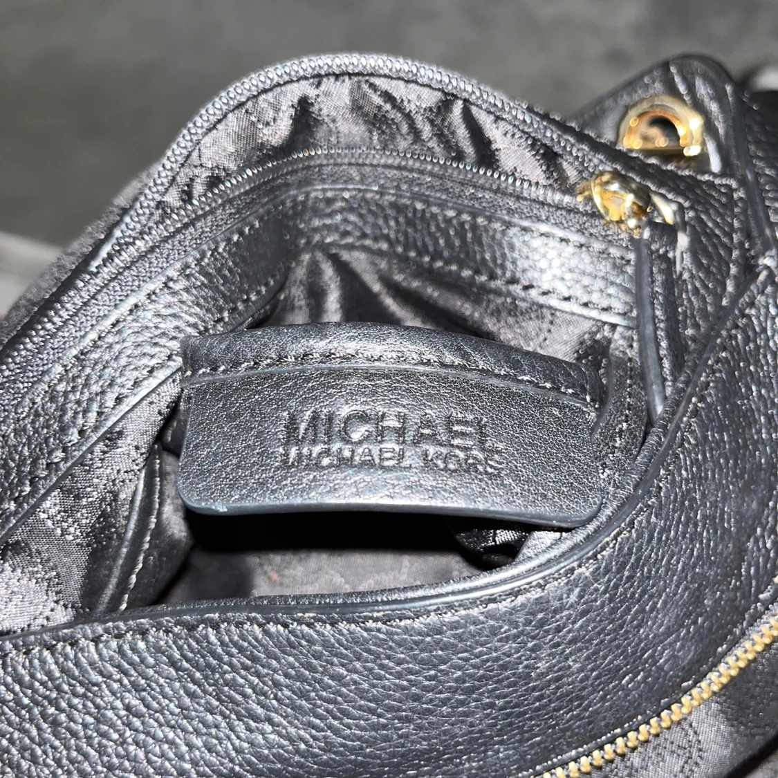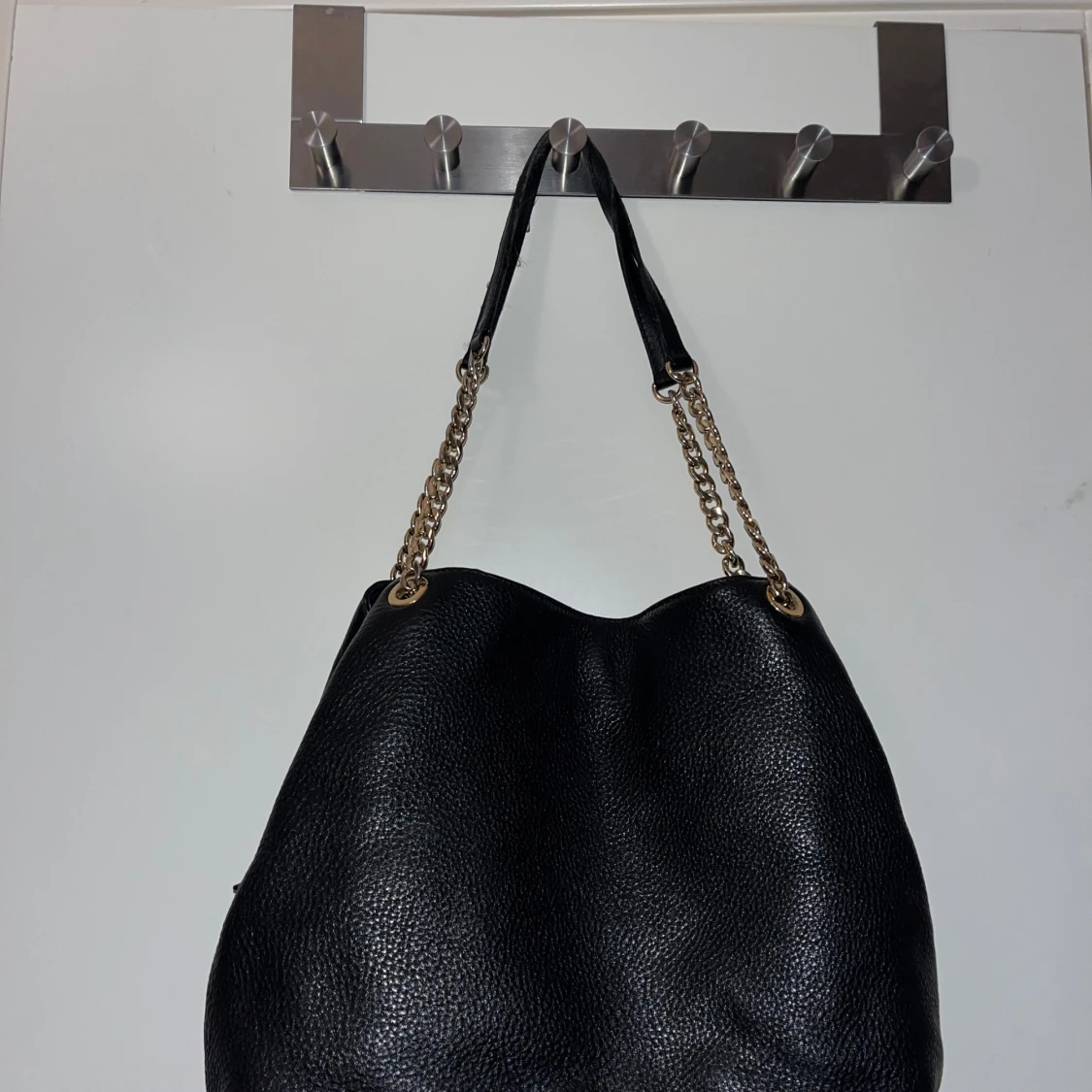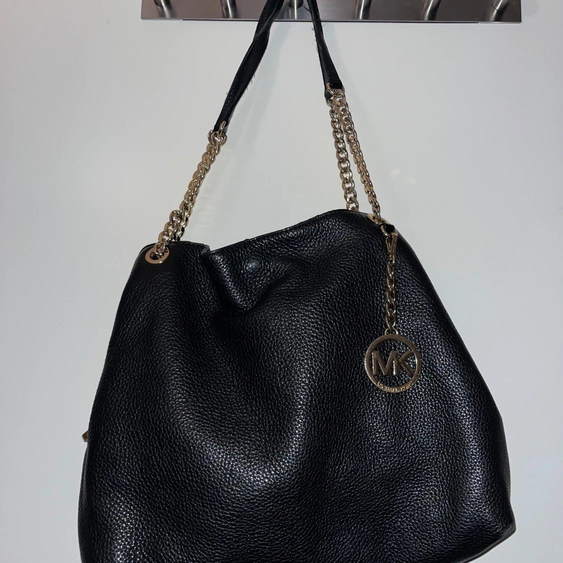 Snygg svart axelväska från Michael Kors i äkta skinn med guldfärgade kedjor och MK-hänge. Väskan har en mjuk, rundad form och detaljer i guld. Perfekt storlek för allt du behöver och med dragkedja på insidan.