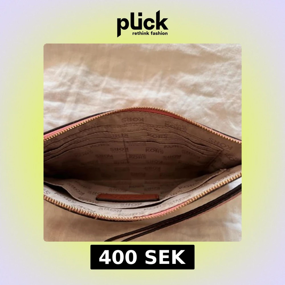 Stilren rosa kuvertväska från Michael Kors i äkta skinn med guldfärgad MK-logga framtill. Väskan har dragkedja upptill, avtagbar handledsrem och flera kortfack på insidan. Perfekt för att bära det viktigaste med snygg och enkel look.