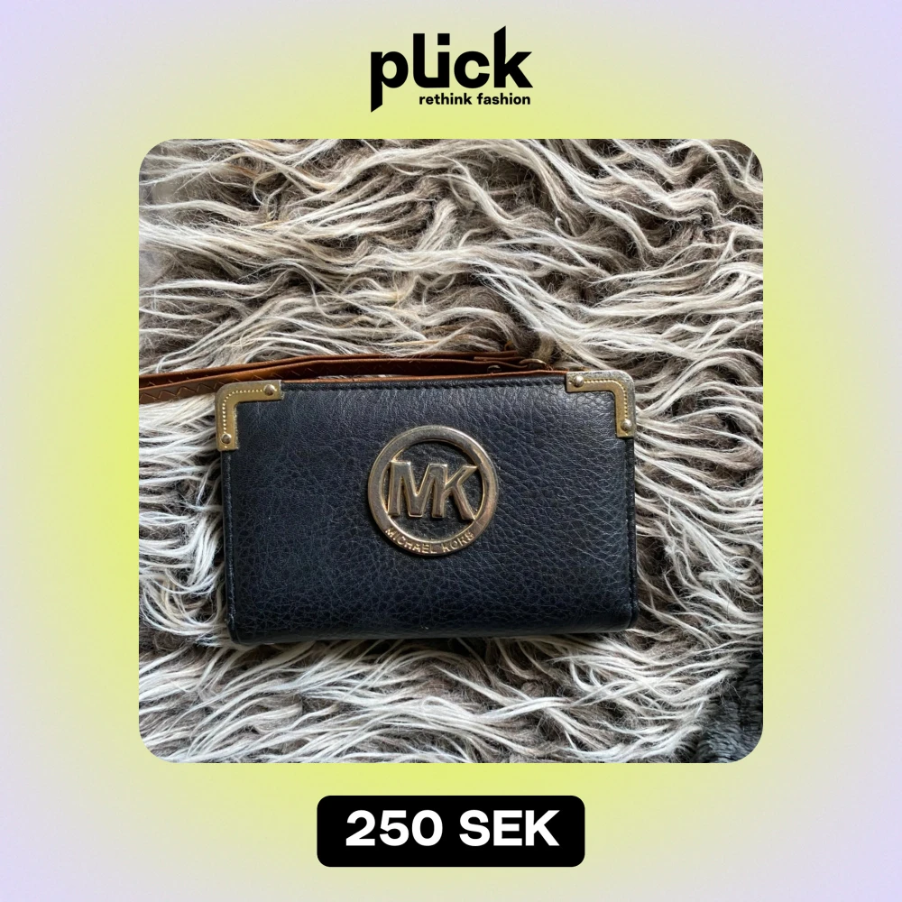 Snygg svart plånbok från Michael Kors i skinn med guldiga detaljer och logga framtill. Insidan är brun med flera fack och dragkedja för mynt. Perfekt för att hålla ordning på kort och kontanter. Stilren och praktisk för vardagsbruk.