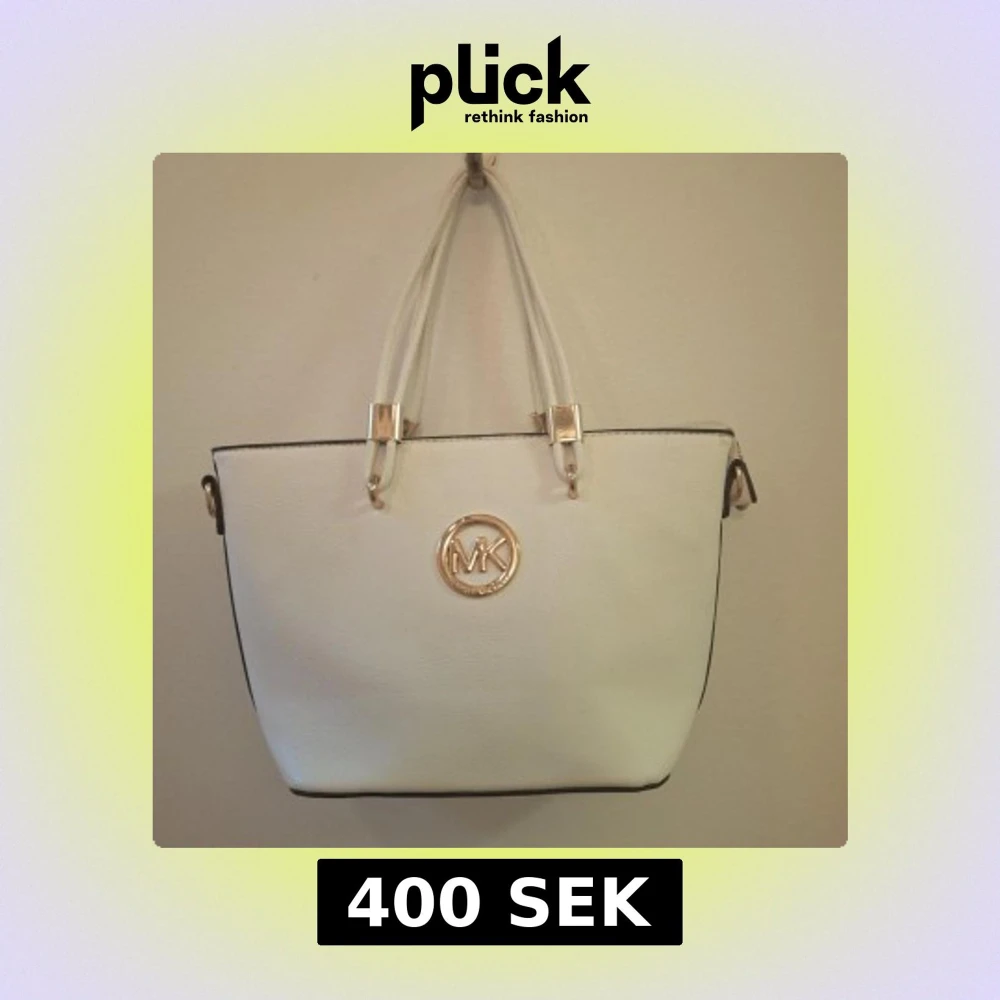 Snygg vit handväska från Michael Kors med guldiga detaljer och MK-logga framtill. Väskan har två rejäla handtag, dragkedja baktill och stilren form. Perfekt för dig som vill ha en klassisk och trendig accessoar.