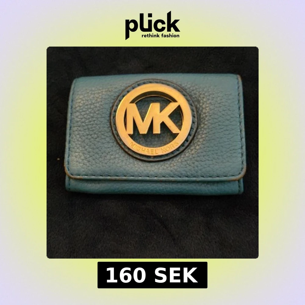 Snygg blå plånbok från Michael Kors i skinn med stort guldfärgat MK-emblem på framsidan. Plånboken har tryckknappsstängning och flera fack för kort och sedlar. Perfekt storlek för att ha med sig överallt och ger en lyxig känsla med sin guldiga detalj. 7×11cm