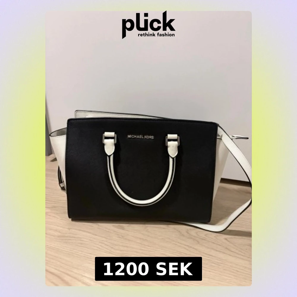 Snygg handväska från Michael Kors i svart och vitt skinn. Väskan har både handtag och axelrem, samt silverfärgade metalldetaljer och dragkedja. Klassisk rektangulär form med logga framtill och stilren design.