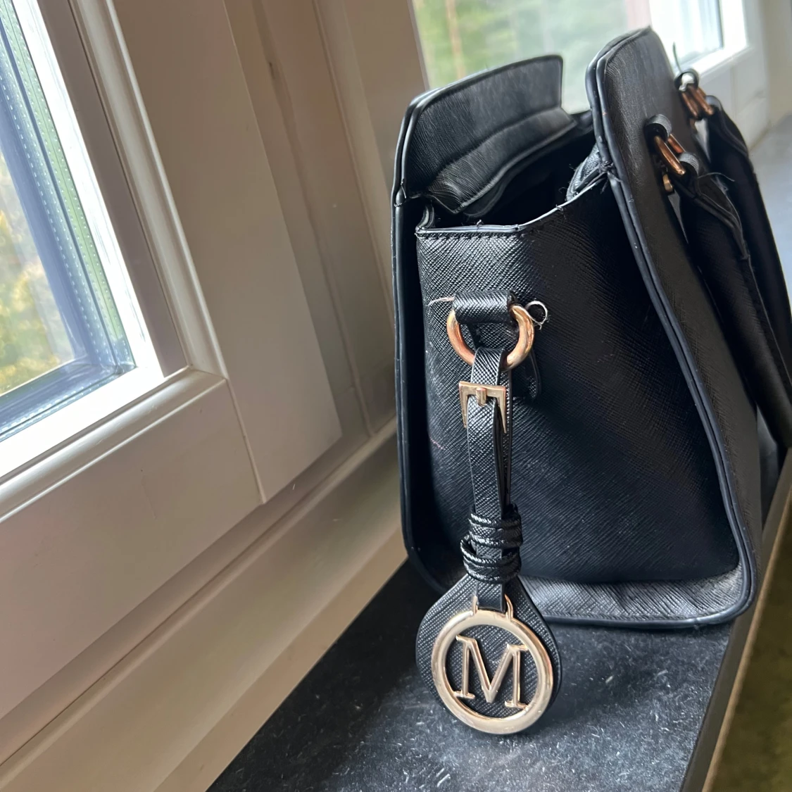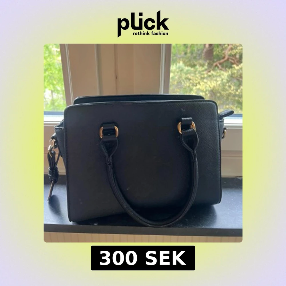Snygg svart handväska från Michael Kors med guldfärgade metalldetaljer och två handtag. Väskan har en klassisk, fyrkantig form och är tillverkad i ett strukturerat syntetmaterial. Perfekt för dig som vill ha en stilren accessoar med lyxig känsla. Nypris 699kr säljer 300