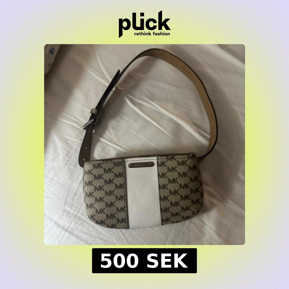 Snygg axelväska från Michael Kors i beige med vitt band och logotypmönster. Väskan har en justerbar axelrem och en dragkedja för säker förvaring. Perfekt för att bära dina nödvändigheter med stil.