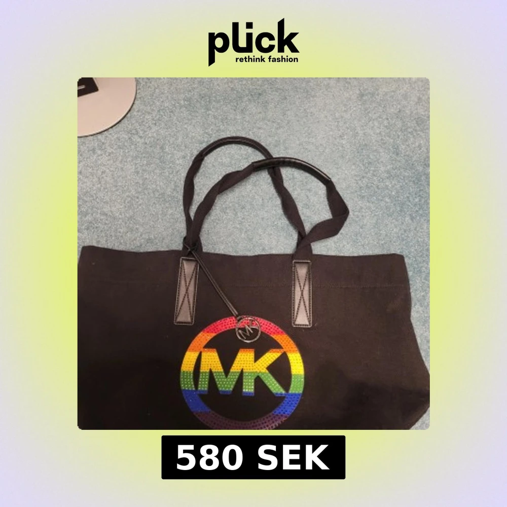 Stor svart shoppingväska från Michael Kors i kraftig bomull med dubbla handtag och snyggt regnbågsfärgat MK-logo framtill. Väskan har en rund MK-tag i metall och detaljer i svart skinn. Perfekt för dig som vill sticka ut med färg och stil.