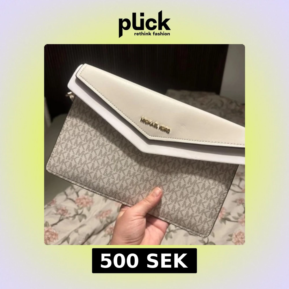 Snygg kuvertväska från Michael Kors i en stilren kombination av vitt och beige. Väskan har ett diskret mönster och en elegant logotyp i guld på framsidan. Perfekt för att bära det viktigaste med stil. Aldrig använd.