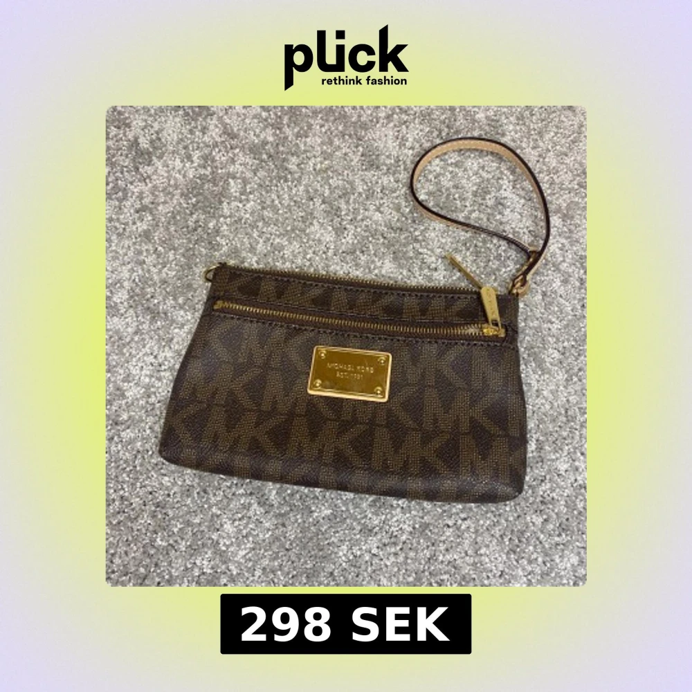 Snygg brun kuvertväska från Michael Kors med guldiga detaljer och logomönster över hela väskan. Väskan har en avtagbar handledsrem och dragkedja upptill samt en extra ficka med dragkedja framtill. Perfekt för att bära det viktigaste med stil.