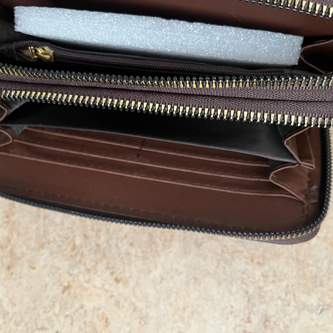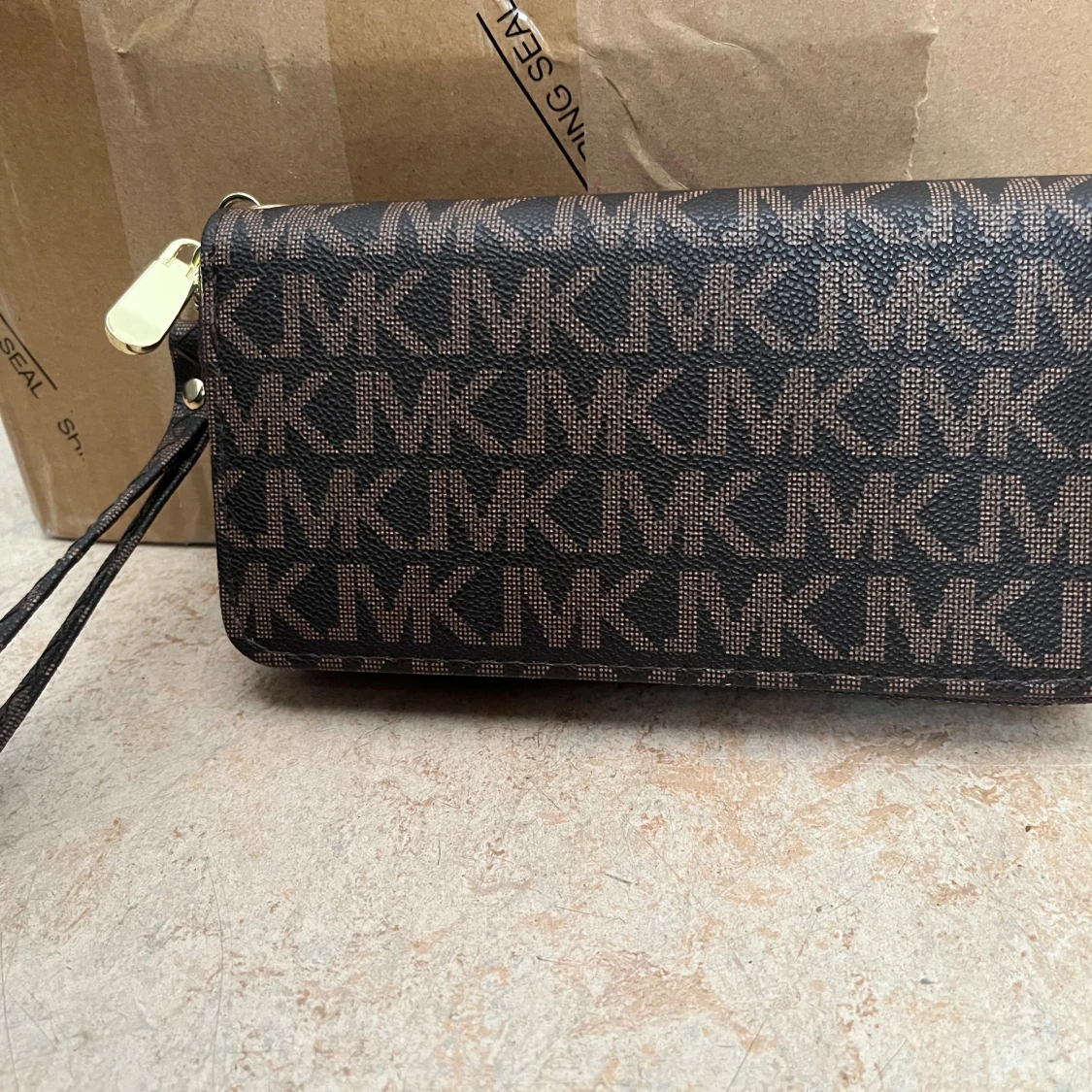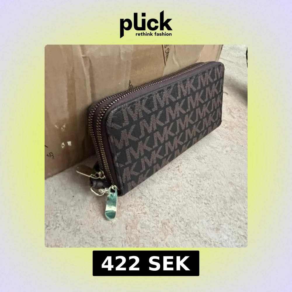 Snygg brun plånbok från Michael Kors med MK-logga över hela ytan. Plånboken har dubbla dragkedjor i guld, flera kortfack och handledsrem. Tillverkad i tåligt syntetmaterial och har ett stilrent, rektangulärt format.