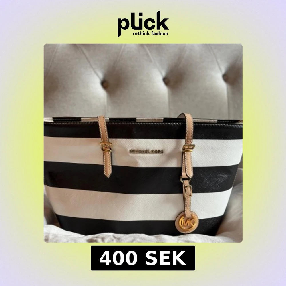 Snygg axelväska från Michael Kors med breda svarta och vita ränder. Väskan har guldfärgade detaljer, två handtag och ett MK-hänge framtill. Perfekt för dig som vill ha en stilren och trendig accessoar. DEFEKT DRAGKEDJA