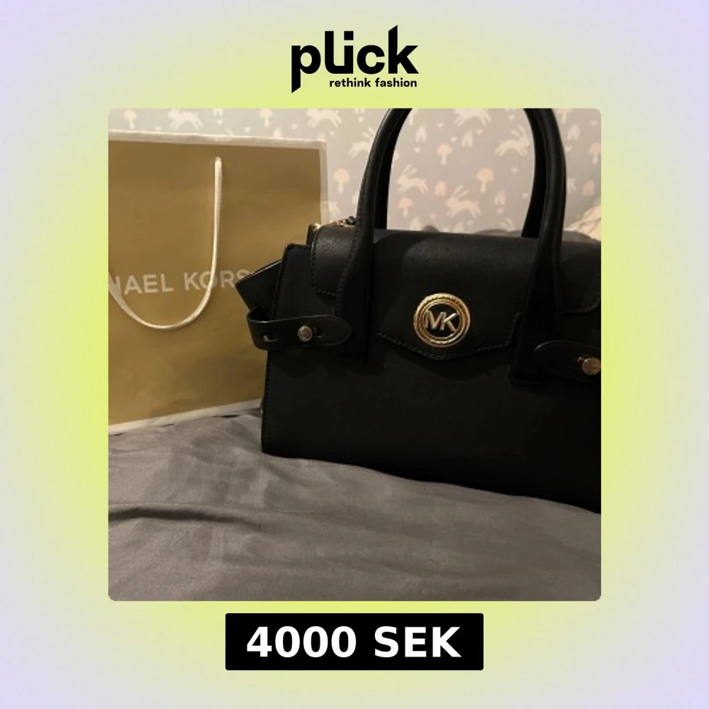 Säljer en stilren svart handväska från Michael Kors med guldfärgade detaljer och MK-logga framtill. Väskan har två handtag och avtagbar axelrem, perfekt för att bära på olika sätt. Klassisk design som passar till många outfits.