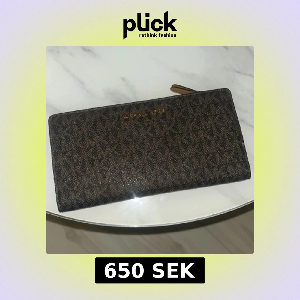 Snygg brun plånbok från Michael Kors med ett diskret mönster och guldfärgad logotyp. Plånboken har en dragkedja och flera fack för kort och kontanter. Perfekt för att hålla ordning på dina värdesaker med stil. Oanvänd köptes från zalando