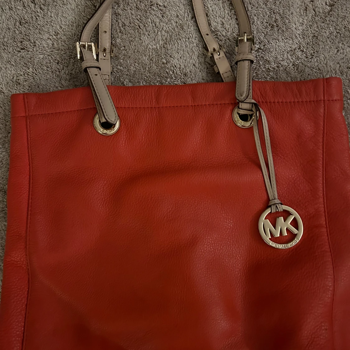Säljer en snygg skinnväska från Michael Kors med beige axelremmar och ett klassiskt MK-hänge. Väskan har en praktisk dragkedja inuti och är perfekt för både vardag och fest. Den behöver en touch up! Den svarta har rosa foder & sparsamt använd