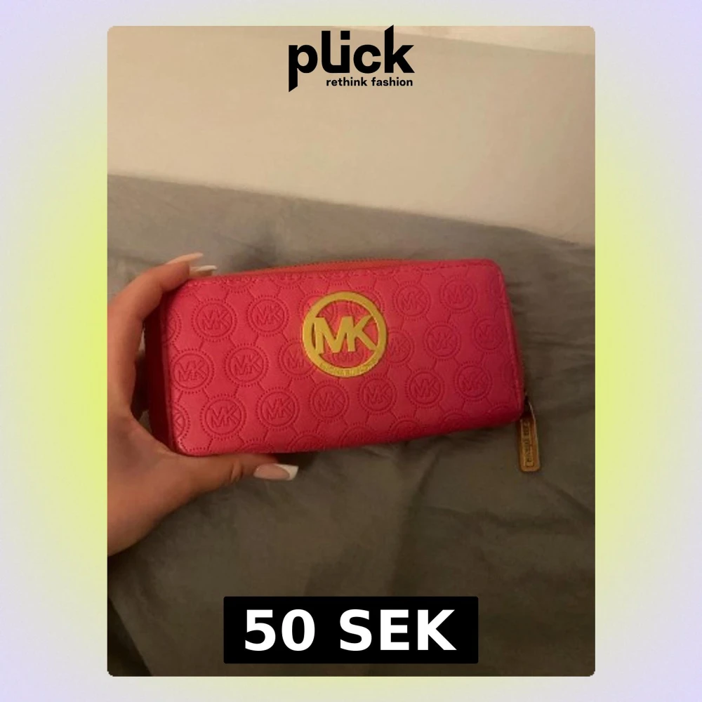 Säljer en snygg rosa plånbok från Michael Kors med guldfärgat MK-emblem och dragkedja. Plånboken har präglat MK-mönster över hela ytan och flera fack för kort och mynt. Perfekt storlek för att ha med sig överallt.