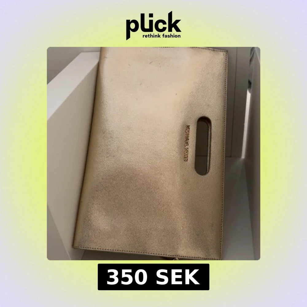 Stilren kuvertväska i guld från Michael Kors med elegant metallogo och praktiskt utskuret handtag. Väskan har en slät, lyxig yta och är perfekt för att lyfta din outfit med en touch av glamour.