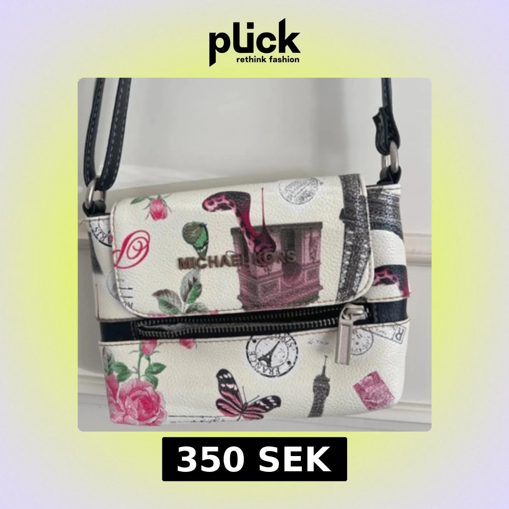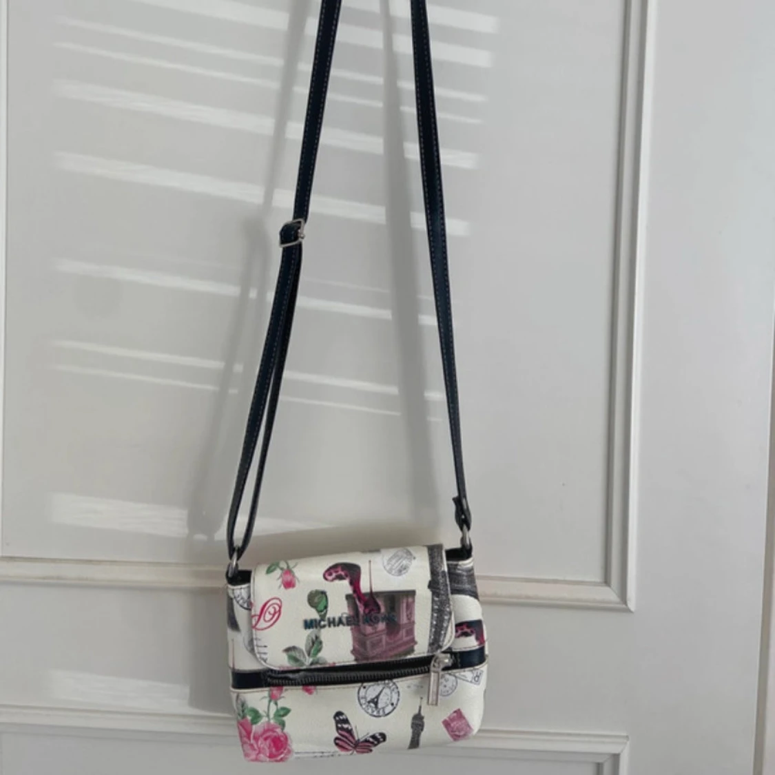 Snygg axelväska från Michael Kors i vitt skinn med coolt Paris-inspirerat tryck. Väskan har detaljer som rosor, fjärilar, frimärken och Eiffeltornet. Justerbar svart axelrem och praktisk dragkedja framtill. Perfekt för dig som gillar unika accessoarer!