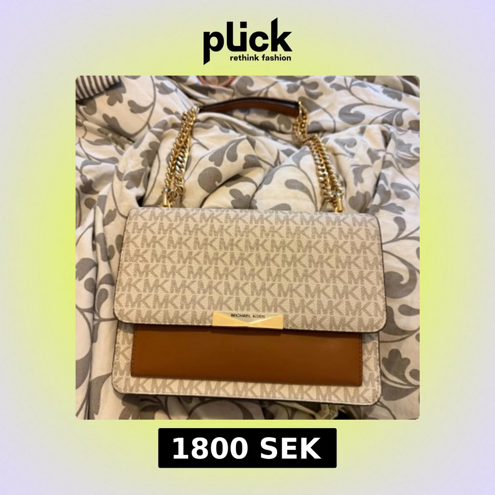 Snygg axelväska från Michael Kors i beige och brunt med MK-logga över hela väskan. Väskan har guldfärgade kedjeremmar och detaljer samt flera fack inuti, inklusive dragkedja. Perfekt för att lyfta din outfit.