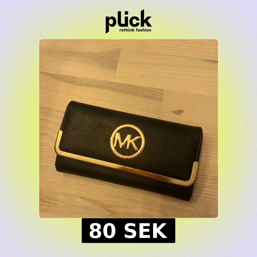 Säljer en svart plånbok från Michael Kors med guldfärgade detaljer och MK-logga framtill. Plånboken har flera fack för kort, myntfack med dragkedja och plats för ID-kort. Perfekt för att hålla ordning på dina värdesaker.