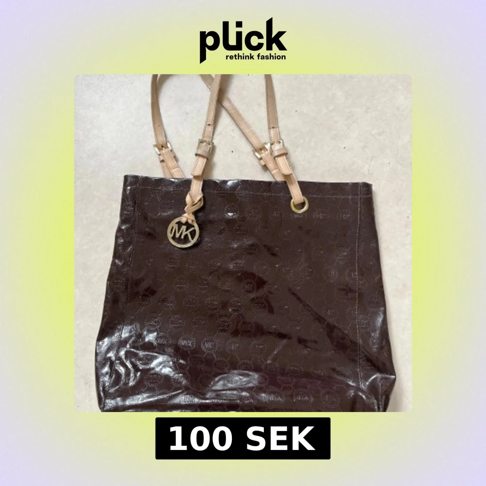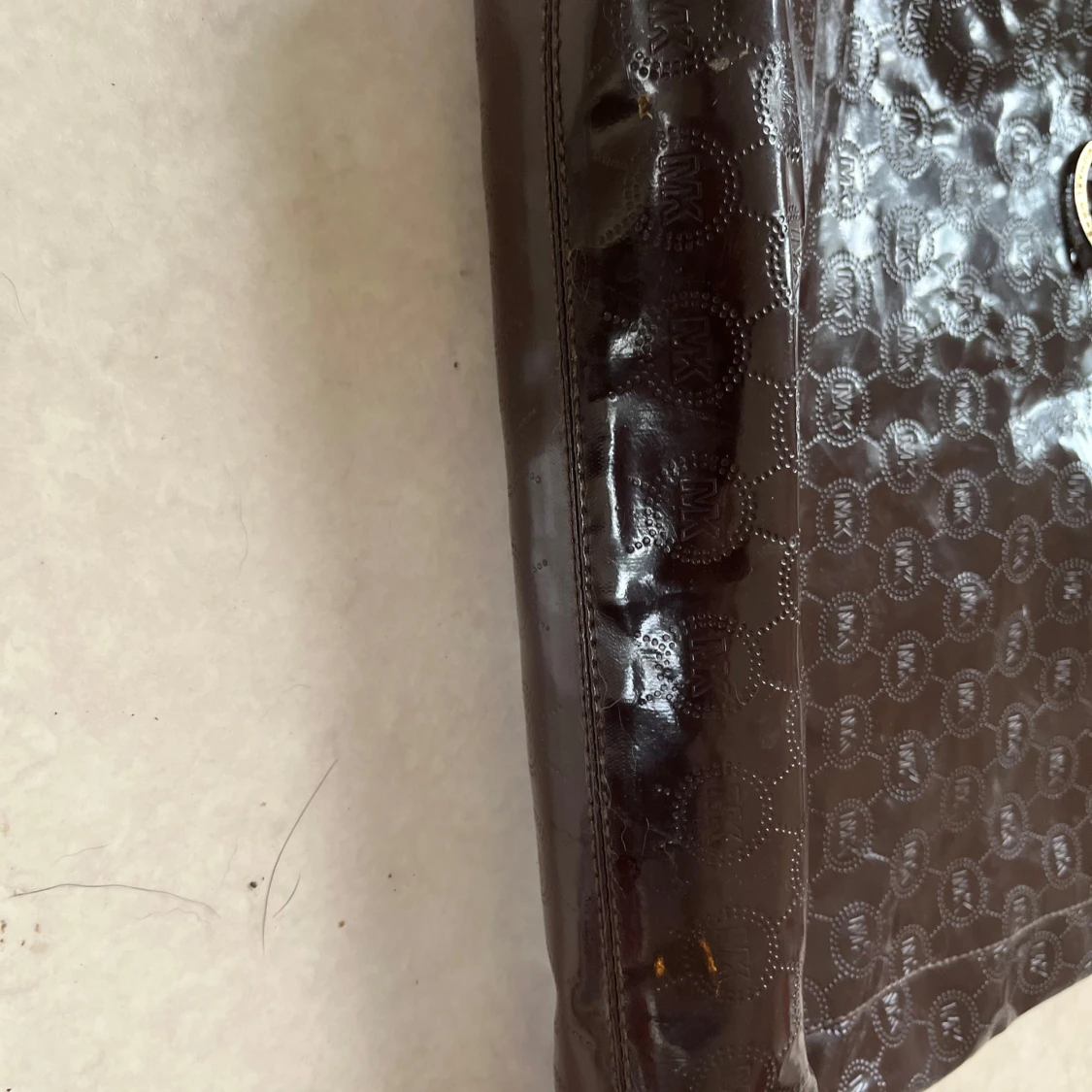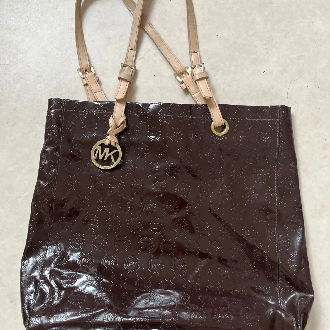 Snygg brun axelväska från Michael Kors med glansig finish och präglat MK-mönster över hela väskan. Väskan har ljusbeigea axelremmar med guldfärgade detaljer och ett MK-hänge framtill. Perfekt storlek för att få plats med allt du behöver.