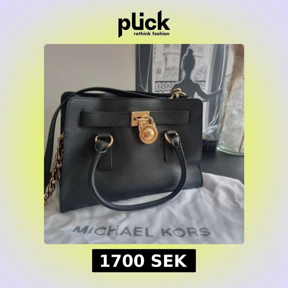 Stilren svart handväska från Michael Kors i skinn med guldfärgade detaljer, kedjerem och klassiskt MK-lås framtill. Väskan har både handtag och axelrem, samt dragkedja på insidan. Perfekt för dig som vill ha en snygg och praktisk väska med lyxig känsla.