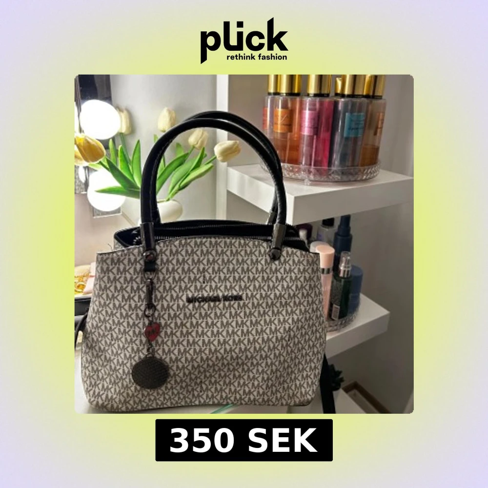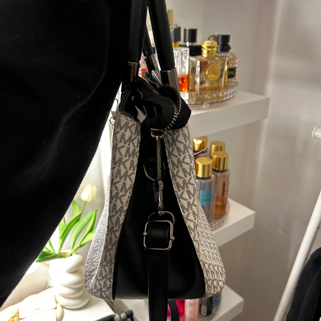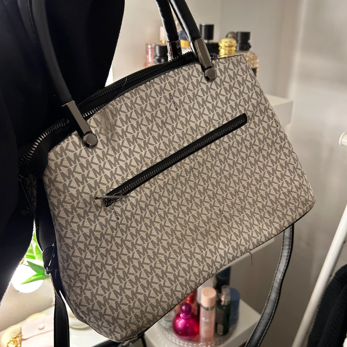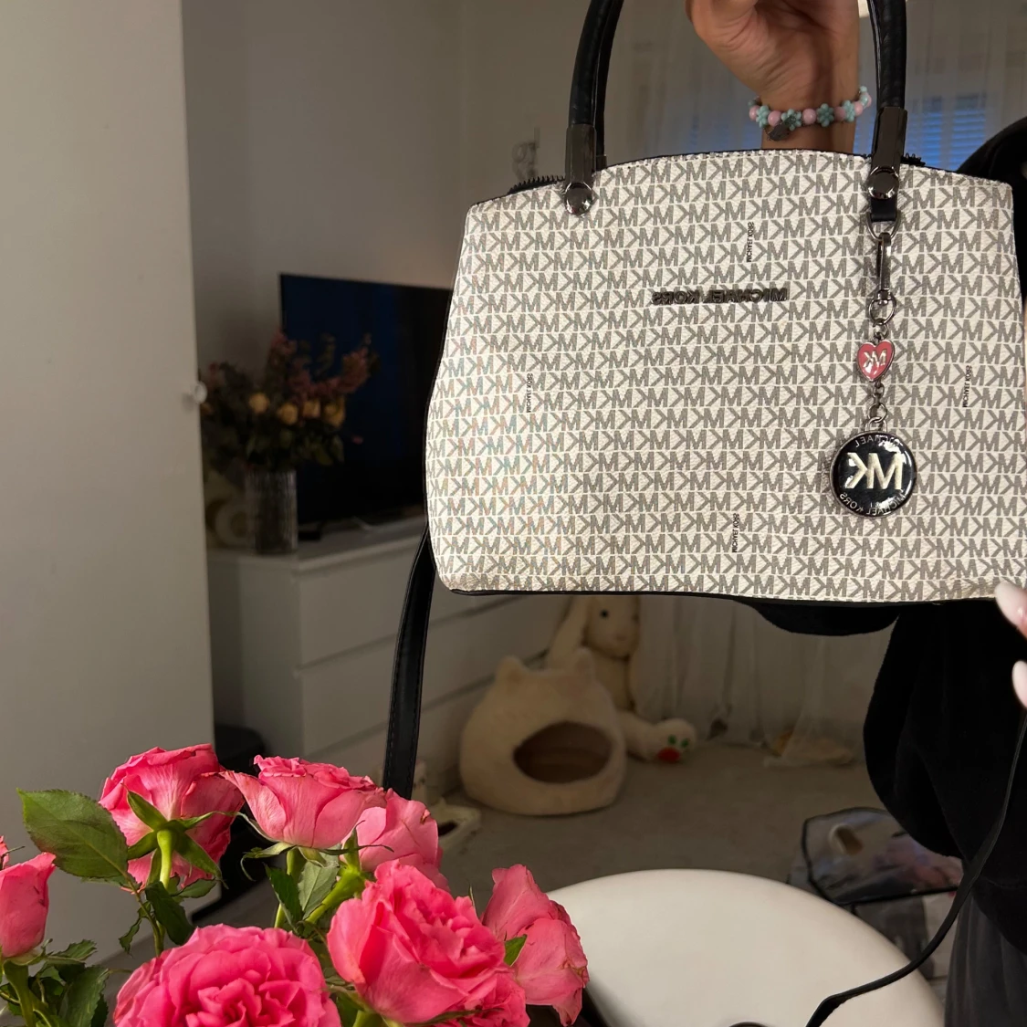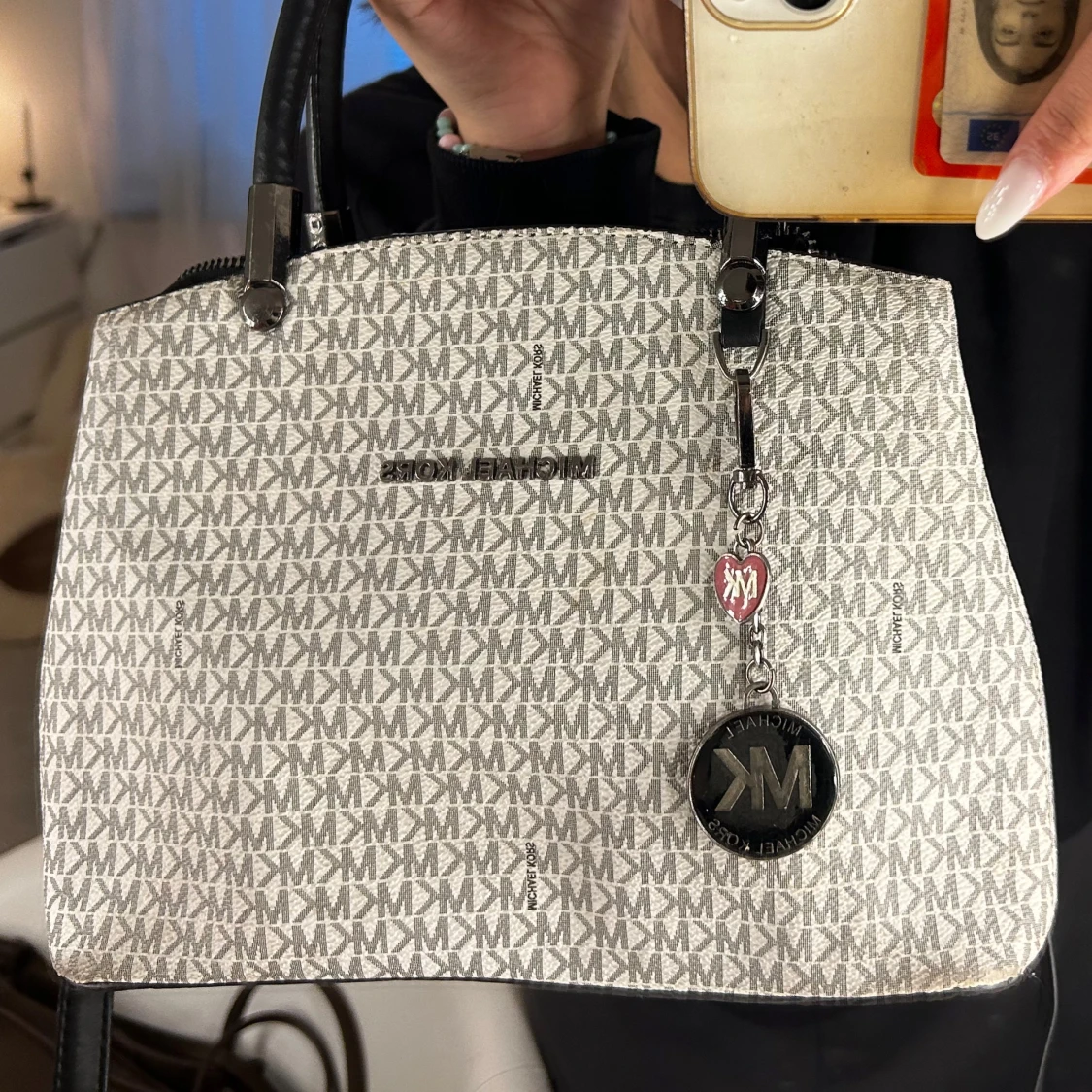 Snygg handväska från Michael Kors i beige och grått med ikoniskt MK-mönster över hela väskan. Väskan har svarta handtag, dragkedja upptill och en dekorativ MK-nyckelring. Perfekt storlek för att få plats med allt du behöver.