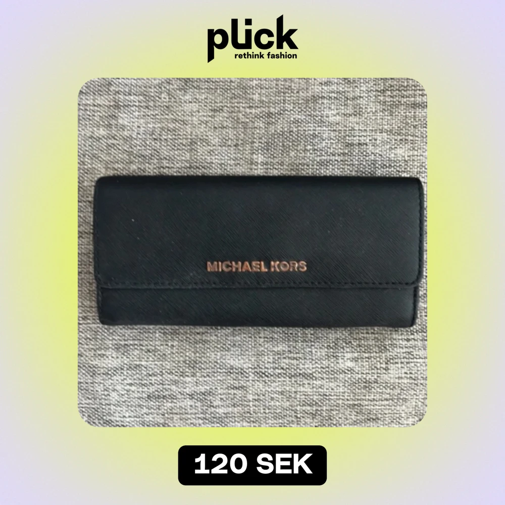 Säljer en stilren svart plånbok från Michael Kors. Den har flera fack för kort och en dragkedja för mynt. Perfekt för att hålla ordning på dina saker med stil. Plånboken är i bra skick och har en elegant design med Michael Kors-loggan i guld på framsidan.
