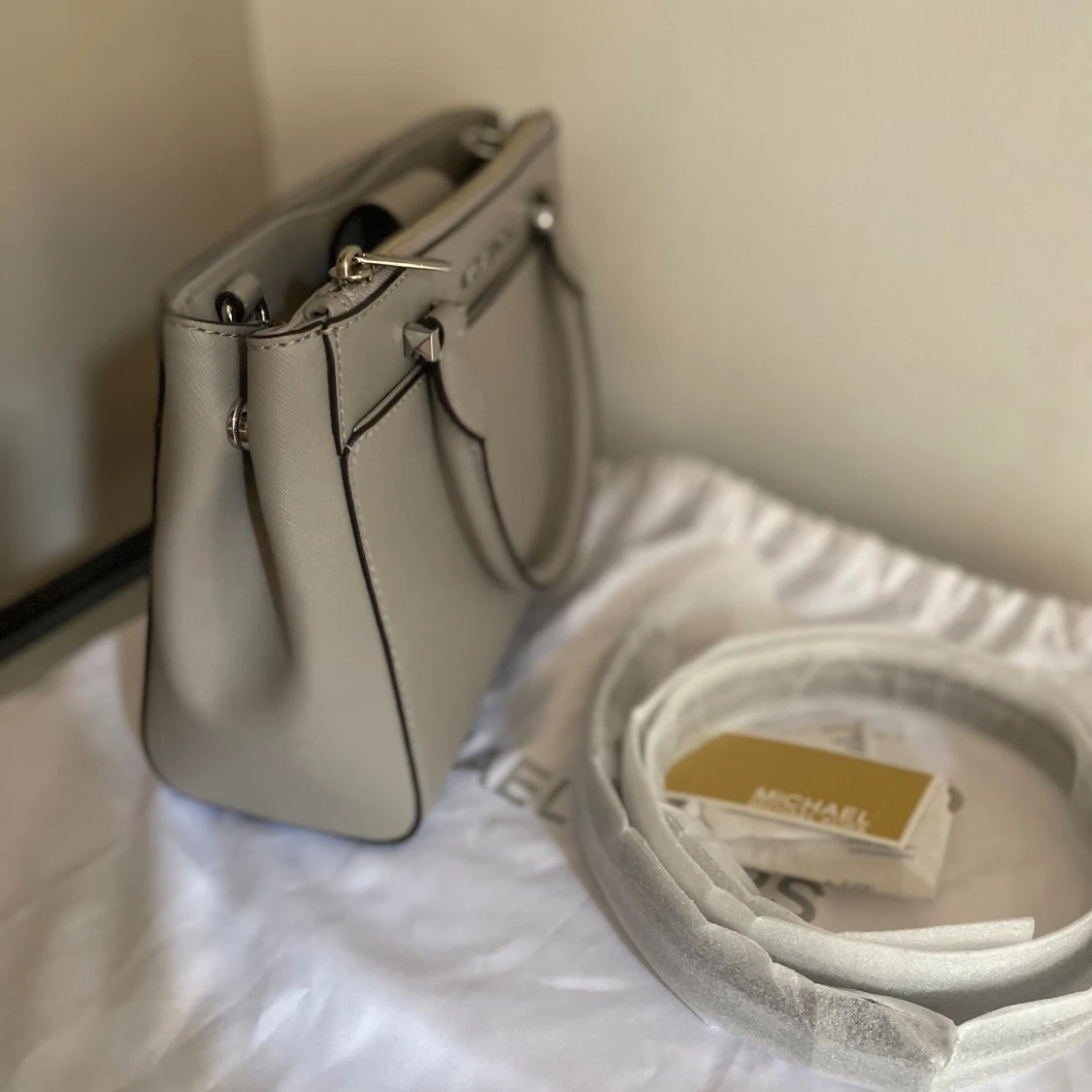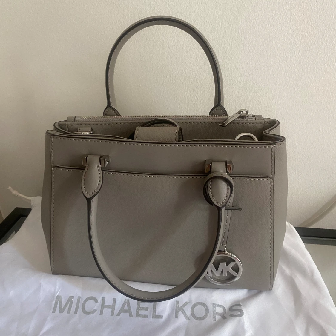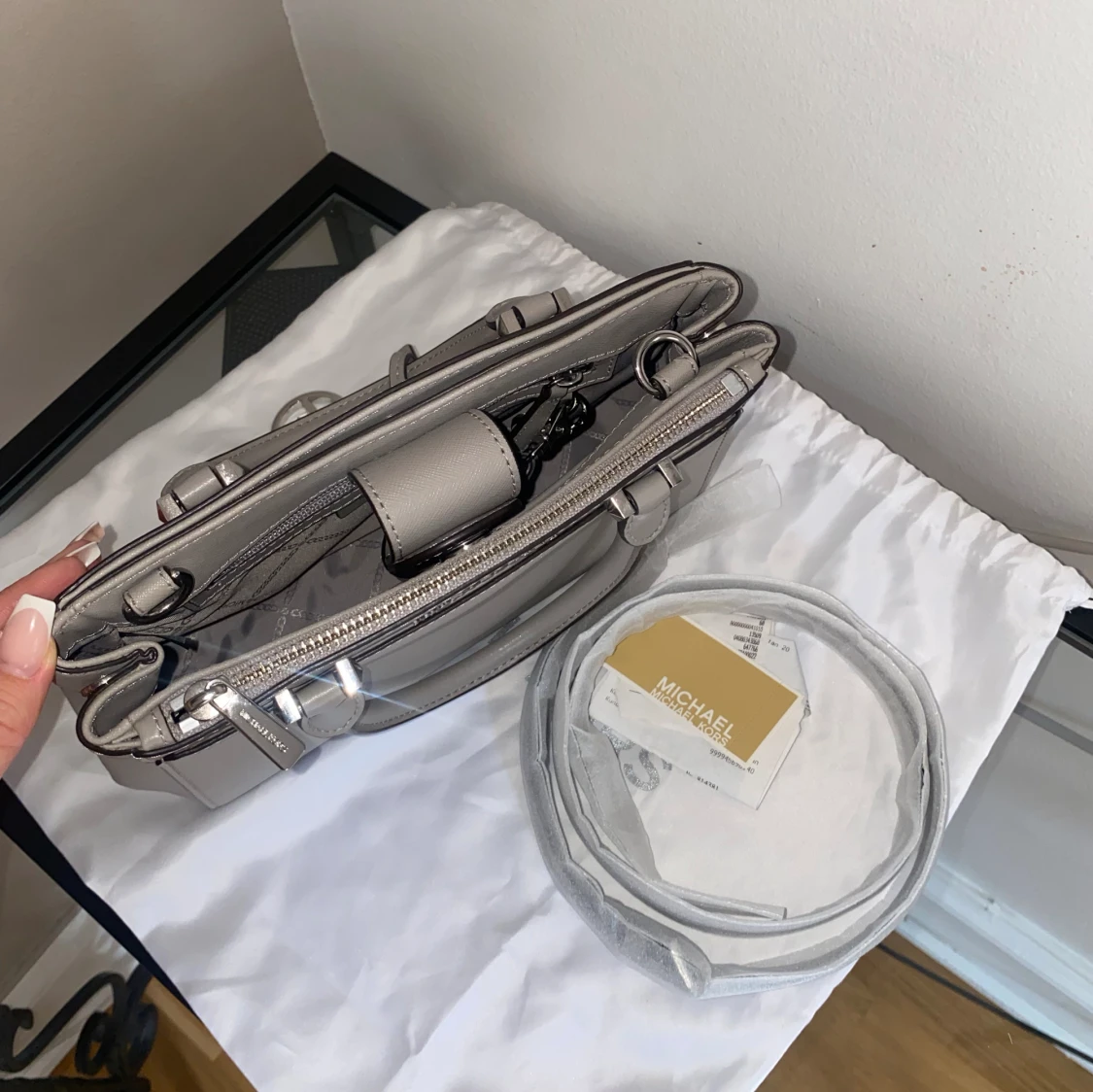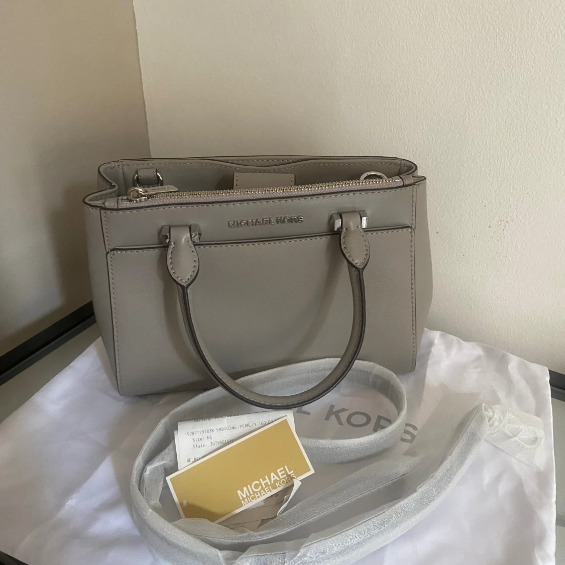 Hej! Jag säljer min super fina Michael Kors väska som är i helt nytt skick. Väskan är i färgen Pearl Grey & modellen heter Gibson-Satchel. Tillsammans med väskan får du med den vita Michael Kors påsen på bilden, oanvänt axelband samt original tag