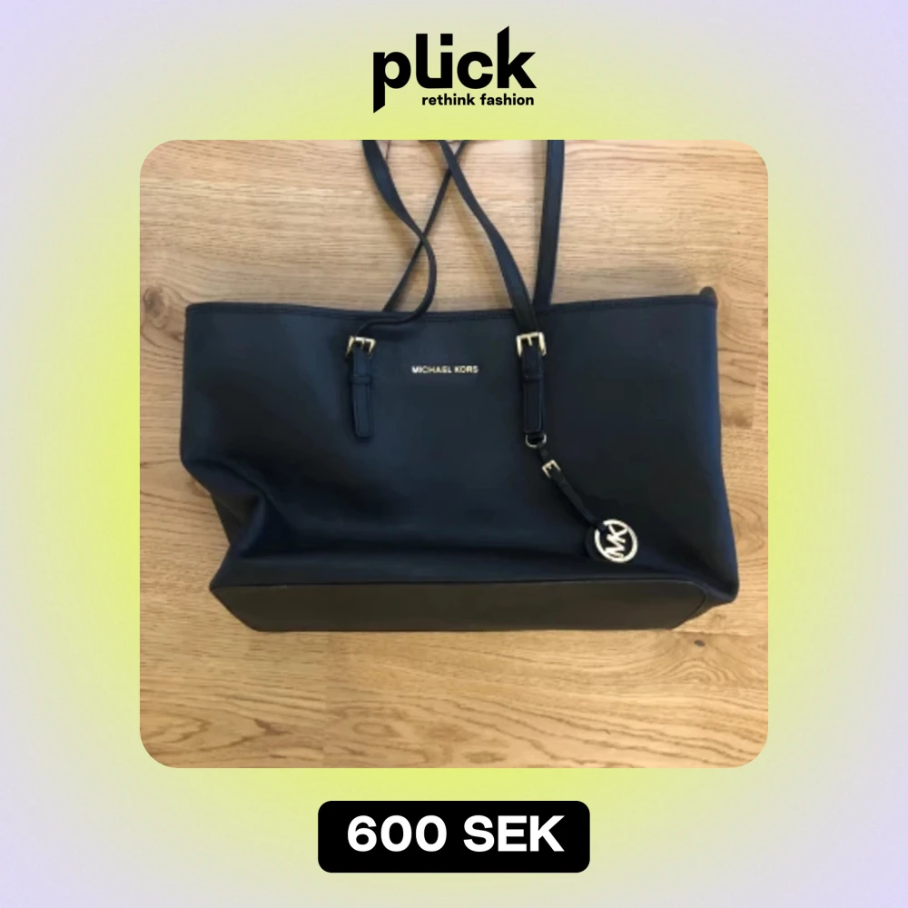 Svart Michael Kors-väska med gulddetaljer. Har slitningar i axelband och märken på det guldiga MK-märket. Väskan har ett innerfack för ex. laptop och andra mindre fack. Dragkedjan för innerfacket är lite trögt ibland, men funkar.