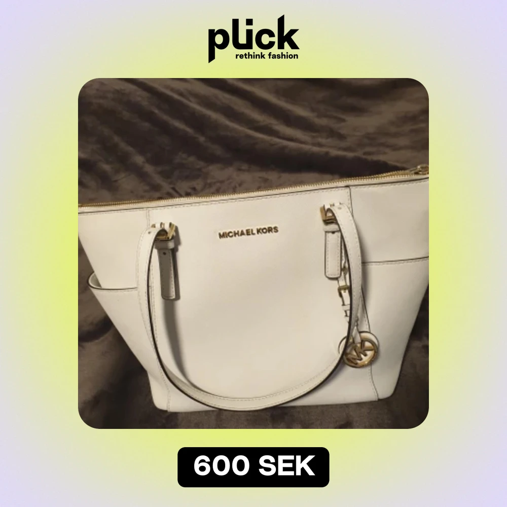 Vit äkta Michael Kors väska med guld detaljer. Tecken på användning finns med den är i gott skick. Köptes på Zalando och nypris ligger på 2500 kr.