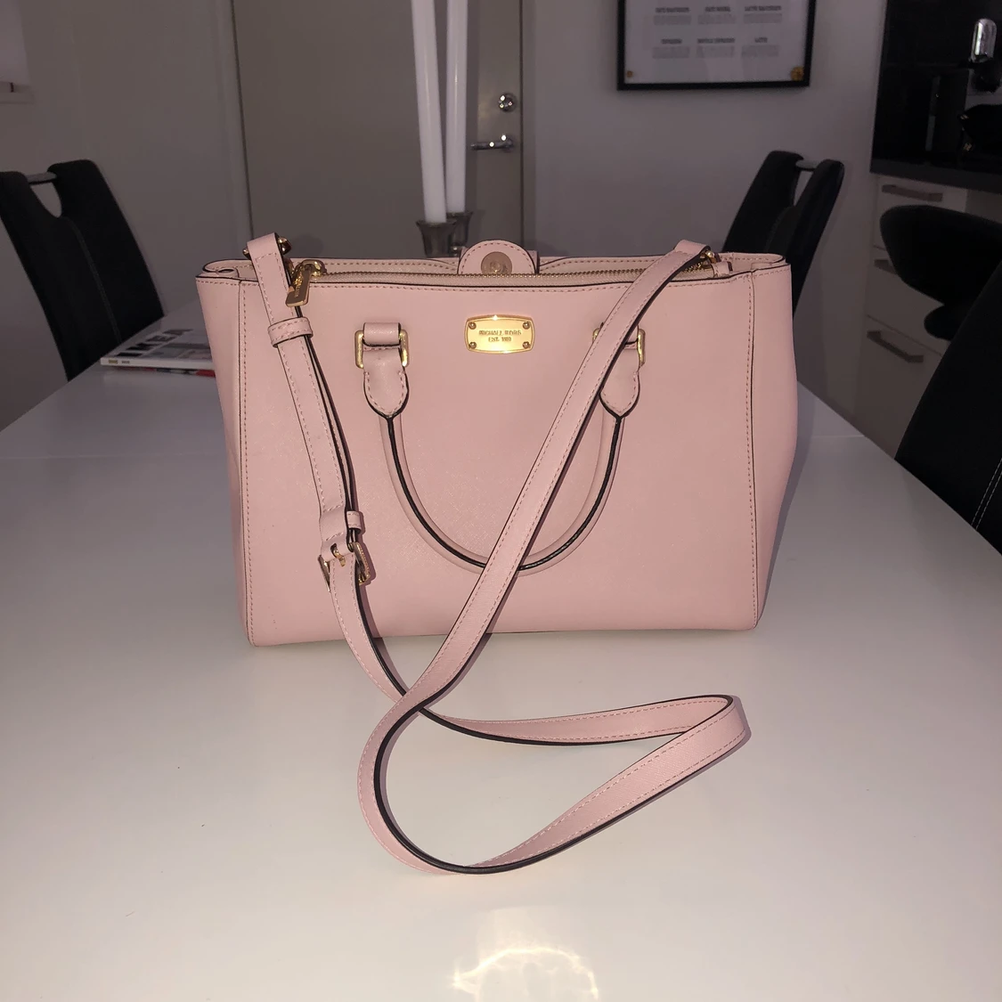 Ljusrosa väska från Michael Kors, en lång axelrem och två mindre handtag. Det långa är avtagbart. Sista bilden visar en liten fläck som finns på baksidan av väskan. Använd ca 2 gånger, och är nästan som ny!