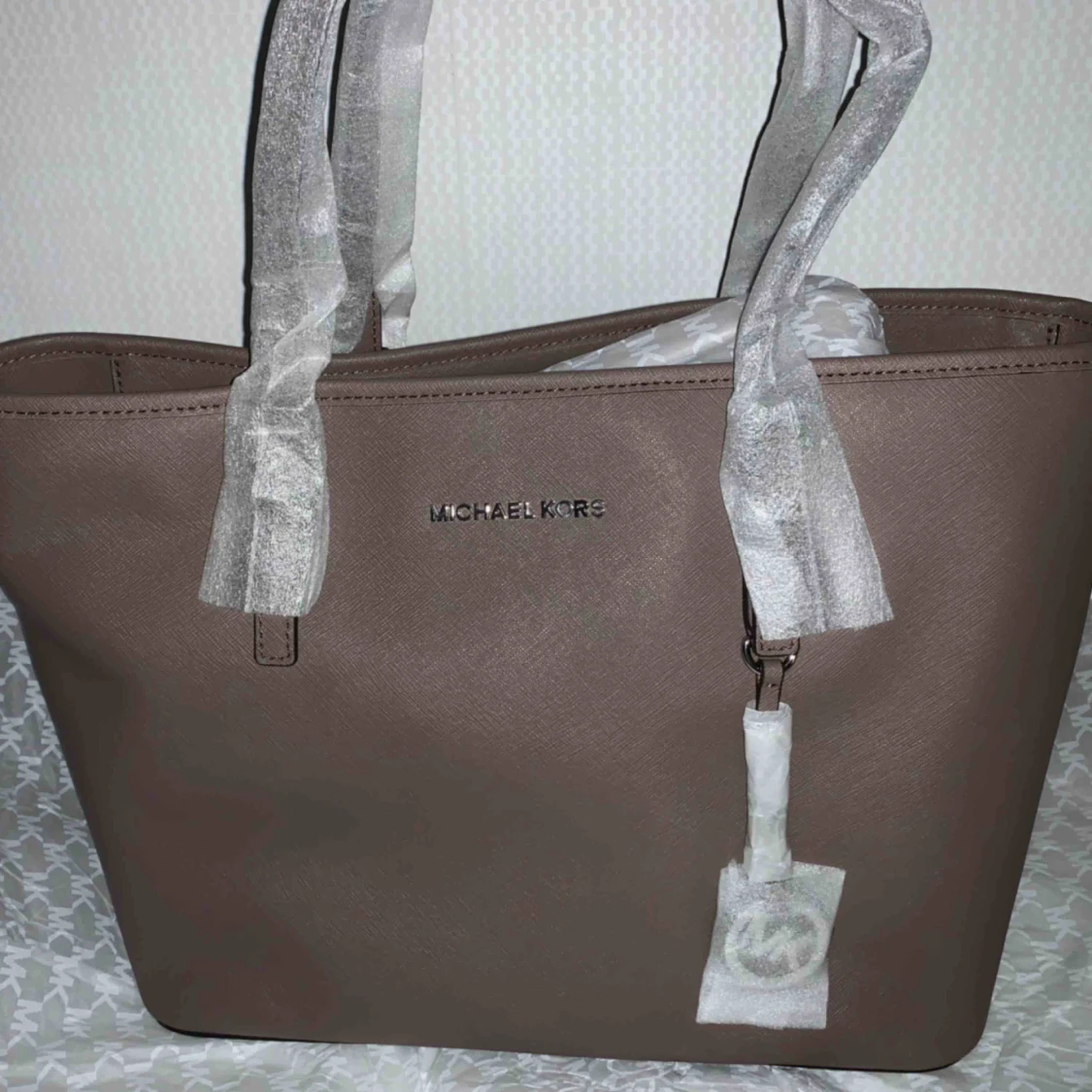 Äkta, oanvänd Michael Kors-väska -Jet set handväska med logtyp och detaljer i silverfärg.