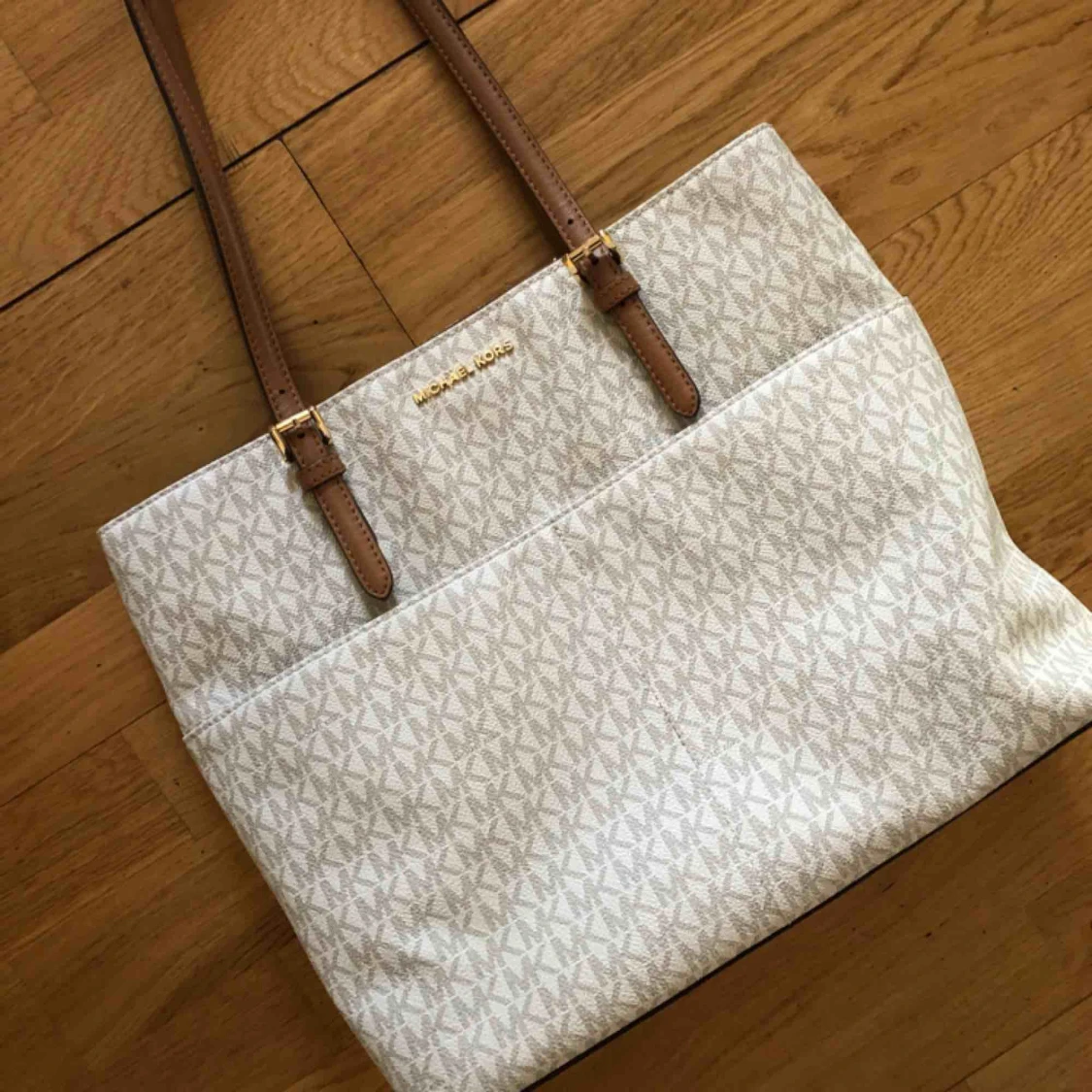Michael Kors väska i vit och brun färg. Fyra ytter- och innerfickor. Använt få gånger, perfekt skick. Säljes pga för lite användning. Ordinarie pris: 1 900kr