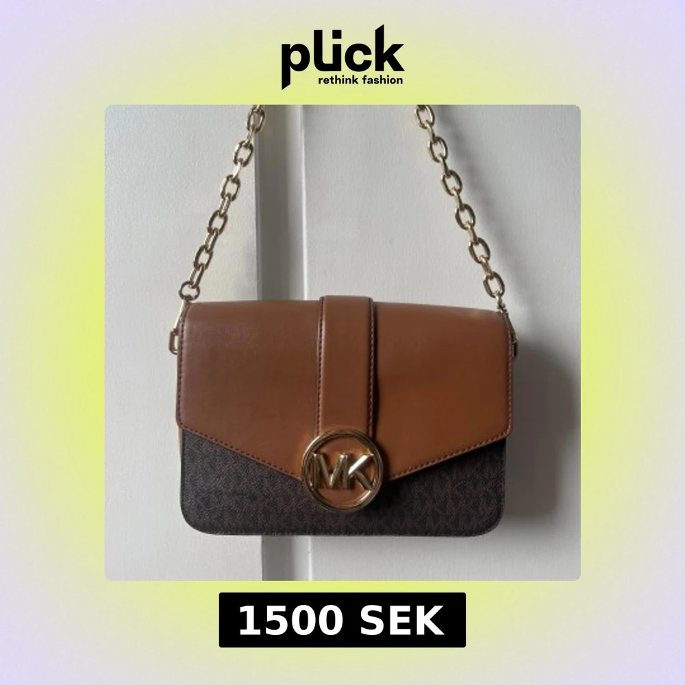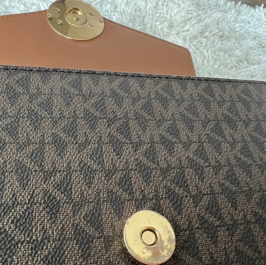Snygg axelväska från Michael Kors i brunt skinn och mörkbrunt mönstrat material. Väska är nästan som nytt skick, har endast tappat lite färg på inre knappen men de syns knappt i verkligenheten speciellt när väskan är stängd. Får plats med väldigt mycket:)