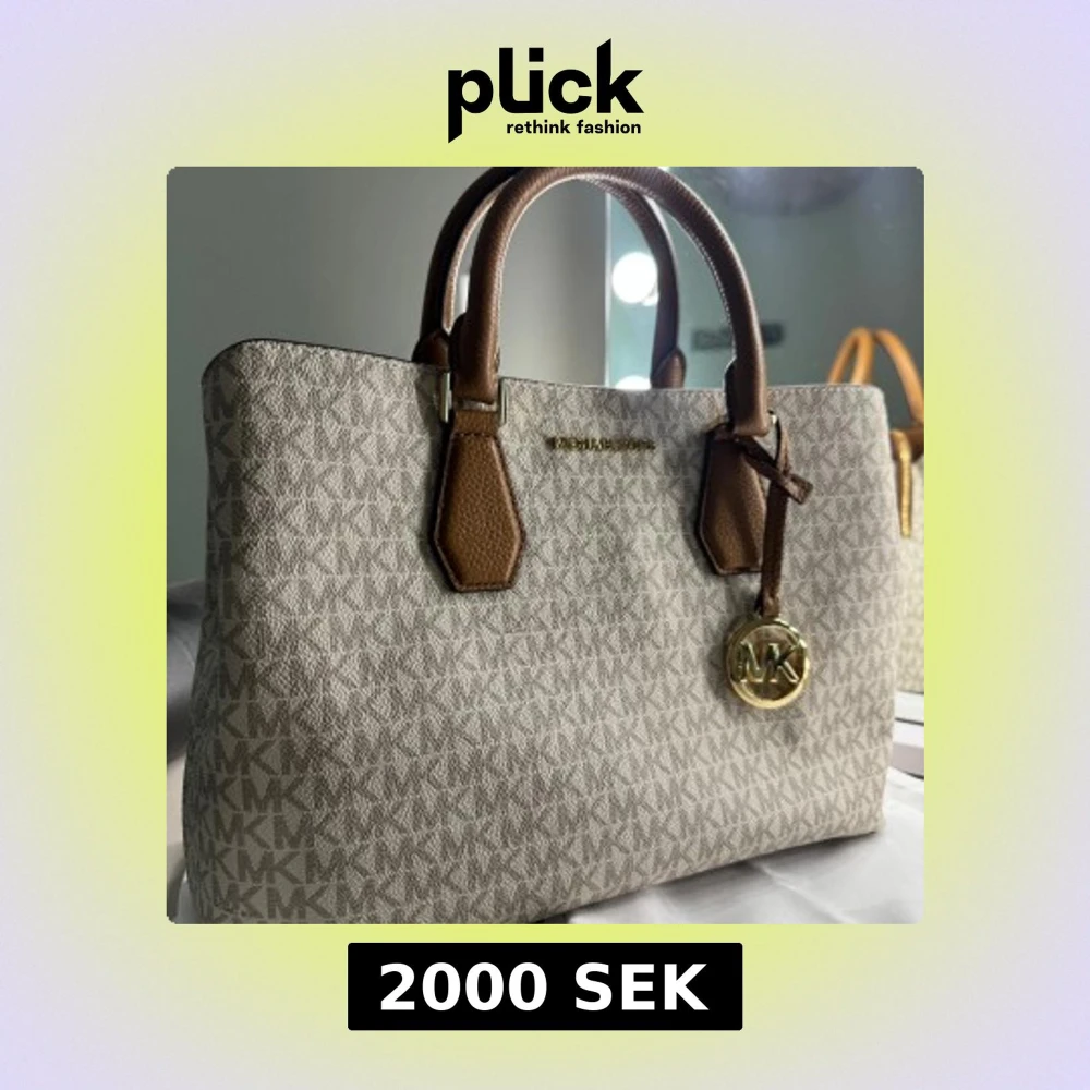 Snygg beige handväska från Michael Kors med MK-logga över hela väskan. Väskan har bruna handtag i skinn och ett guldigt MK-hänge. Perfekt storlek för allt du behöver och riktigt stilren design med diskret mönster. Använd endast en gång.