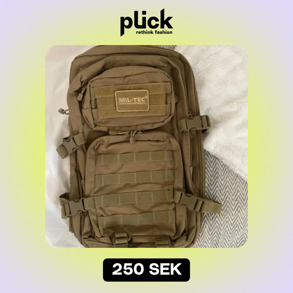 Stilren, praktisk ryggsäck från Mil-Tec med utrymme på 36 liter i färgen Coyote. Molle-system på framsidan och sidorna av ryggsäcken för att kunna bygga ut med extra fickor efter egna behov. Sparsamt använd.