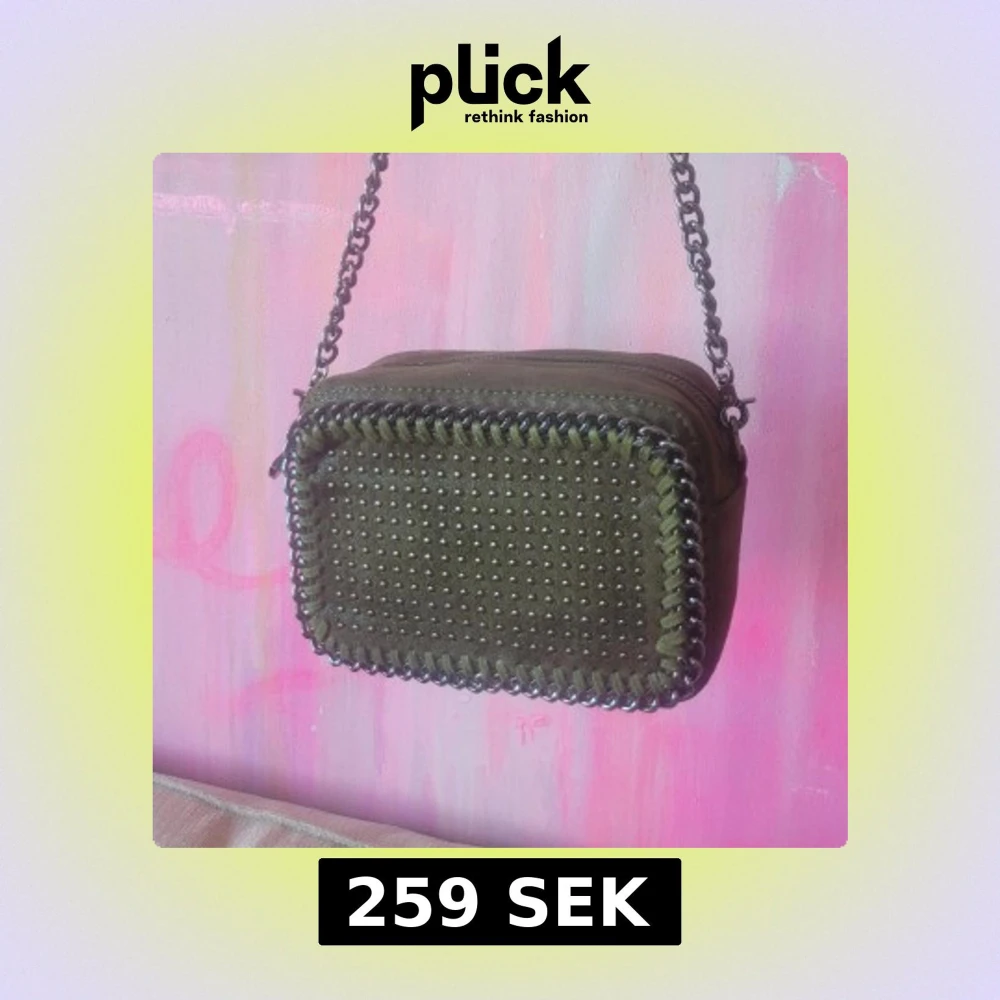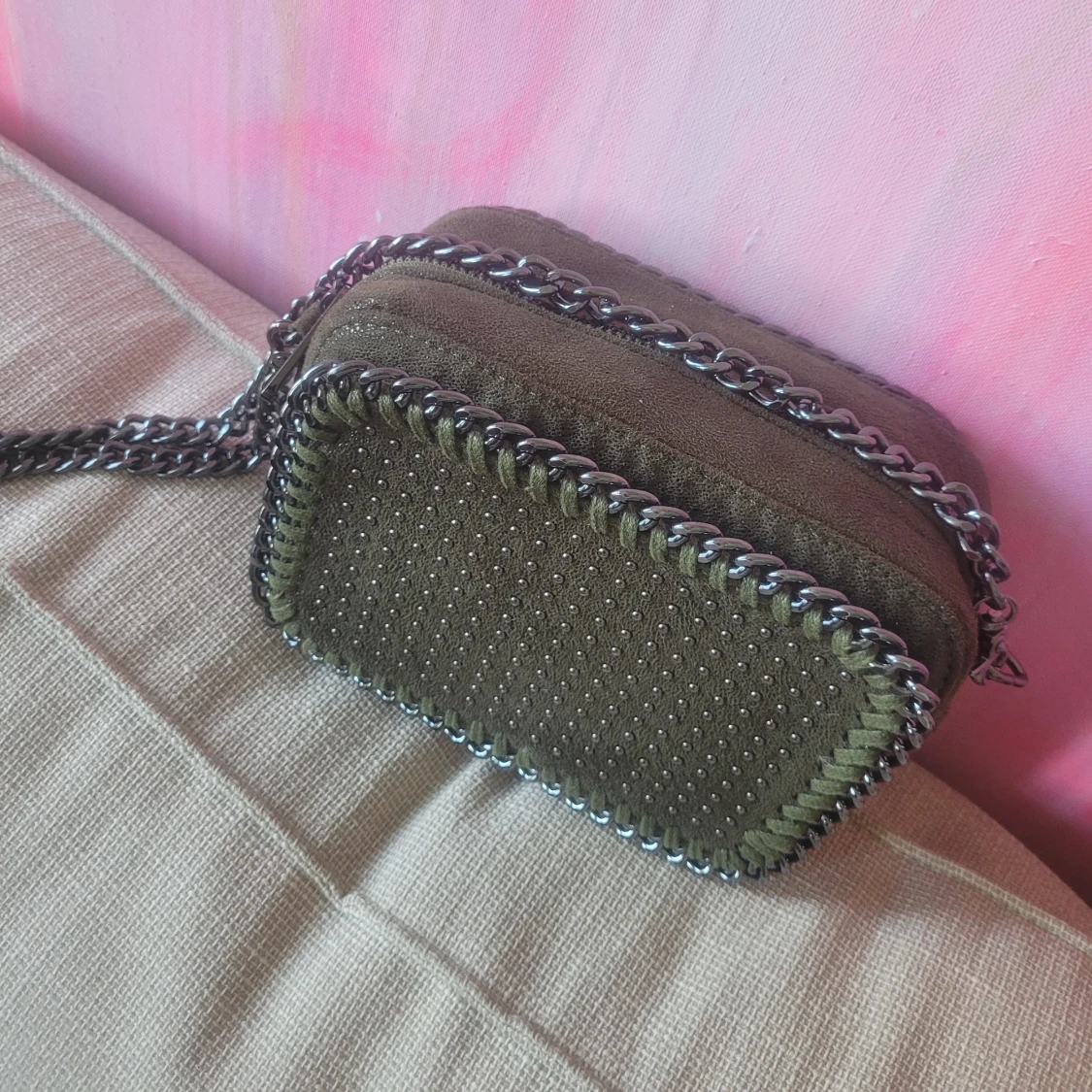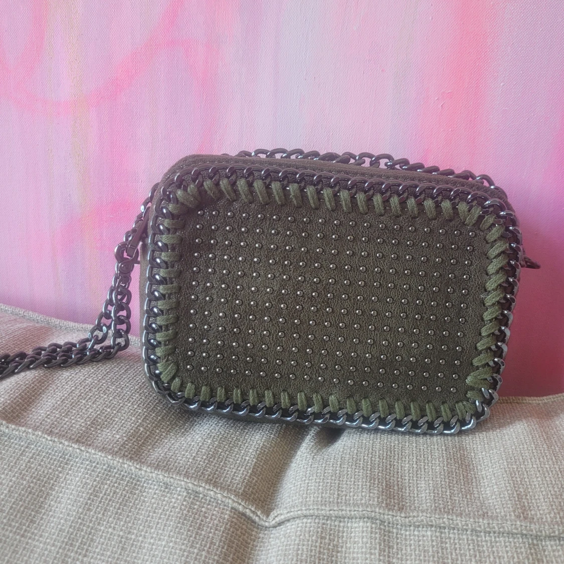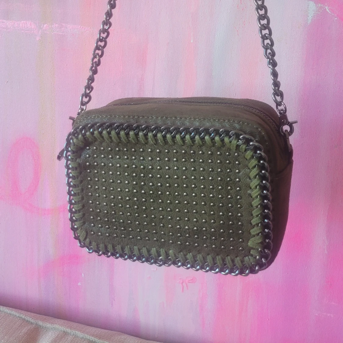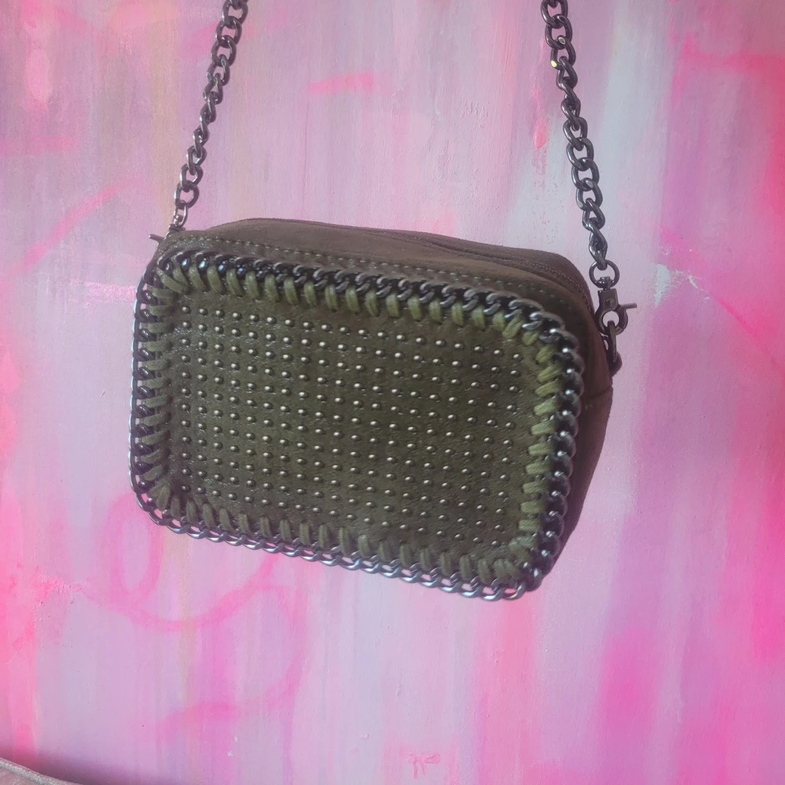 Snygg militärgrön väska i mocka med coola silverfärgade nitar på framsidan och grov kedjerem. Väskan har rektangulär form, dragkedja upptill och dekorativ kant. Perfekt för dig som gillar edgy accessoarer. Så himla snygg men kommer inte till användning! Aldrig använd!!💚