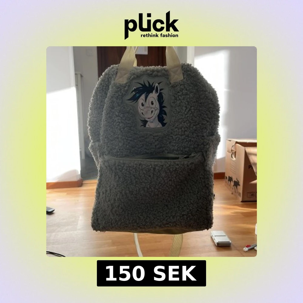 Supermysig ryggsäck i grå teddy med en stor ficka framtill och dragkedja. Framsidan har en cool patch med en tecknad häst. Baksidan och axelremmarna är i ljusgrönt tyg. Perfekt för dig som vill sticka ut med en unik och gullig väska.