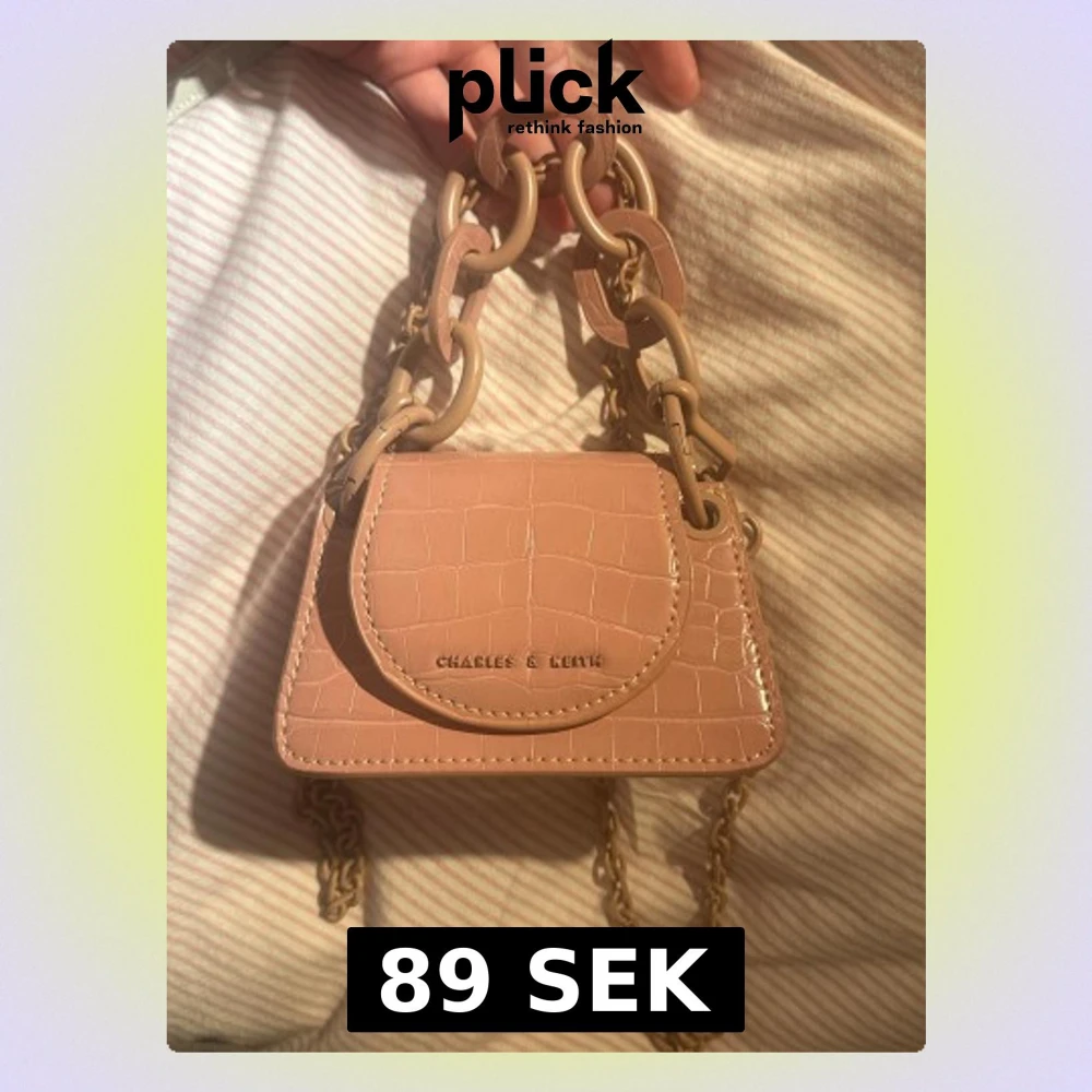Superfin liten handväska i ljusrosa från Charles & Keith med croco-mönstrad yta. Väskan har chunky plastkedja som handtag och guldfärgad kedja som axelrem. Perfekt för det viktigaste och ger en trendig vibe till din outfit.