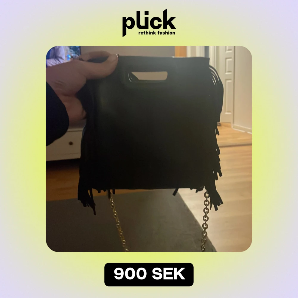 Säljer en snygg svart axelväska med fransar och kedjedetaljer. Perfekt för en kväll ute eller en dag på stan. Väskan har ett handtag upptill och är i mycket bra skick. Den är både stilren och trendig!