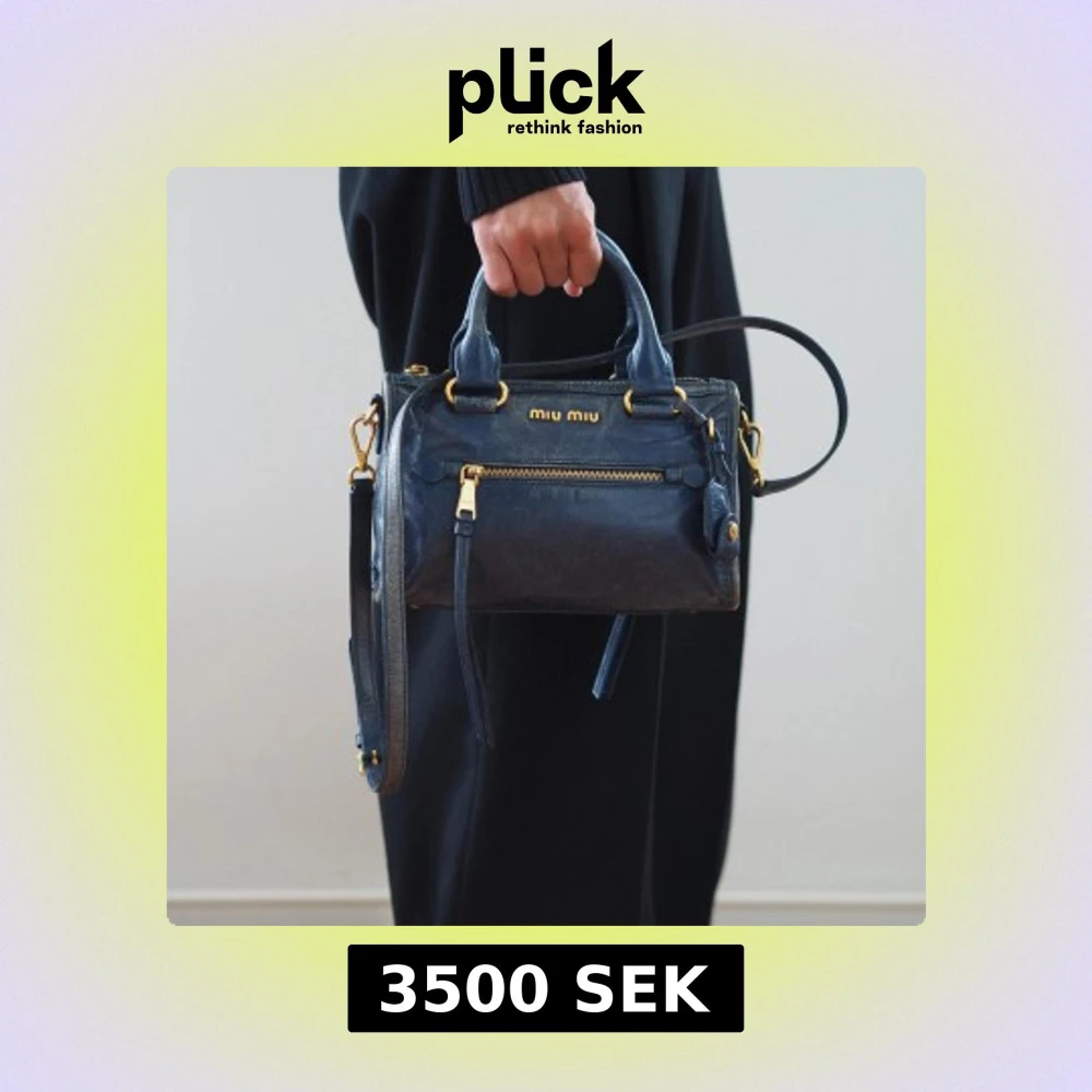 Snygg mörkblå handväska från Miu Miu i äkta skinn med guldfärgade metalldetaljer. Väskan har både handtag och axelrem, samt en praktisk dragkedja framtill. Perfekt storlek för det viktigaste och en stilren look med exklusiv känsla.