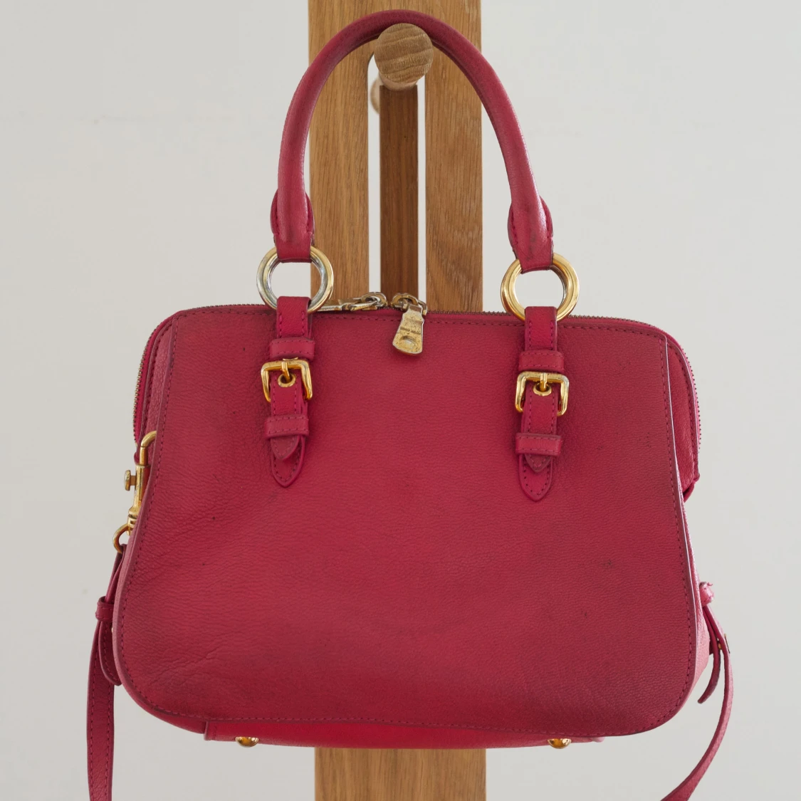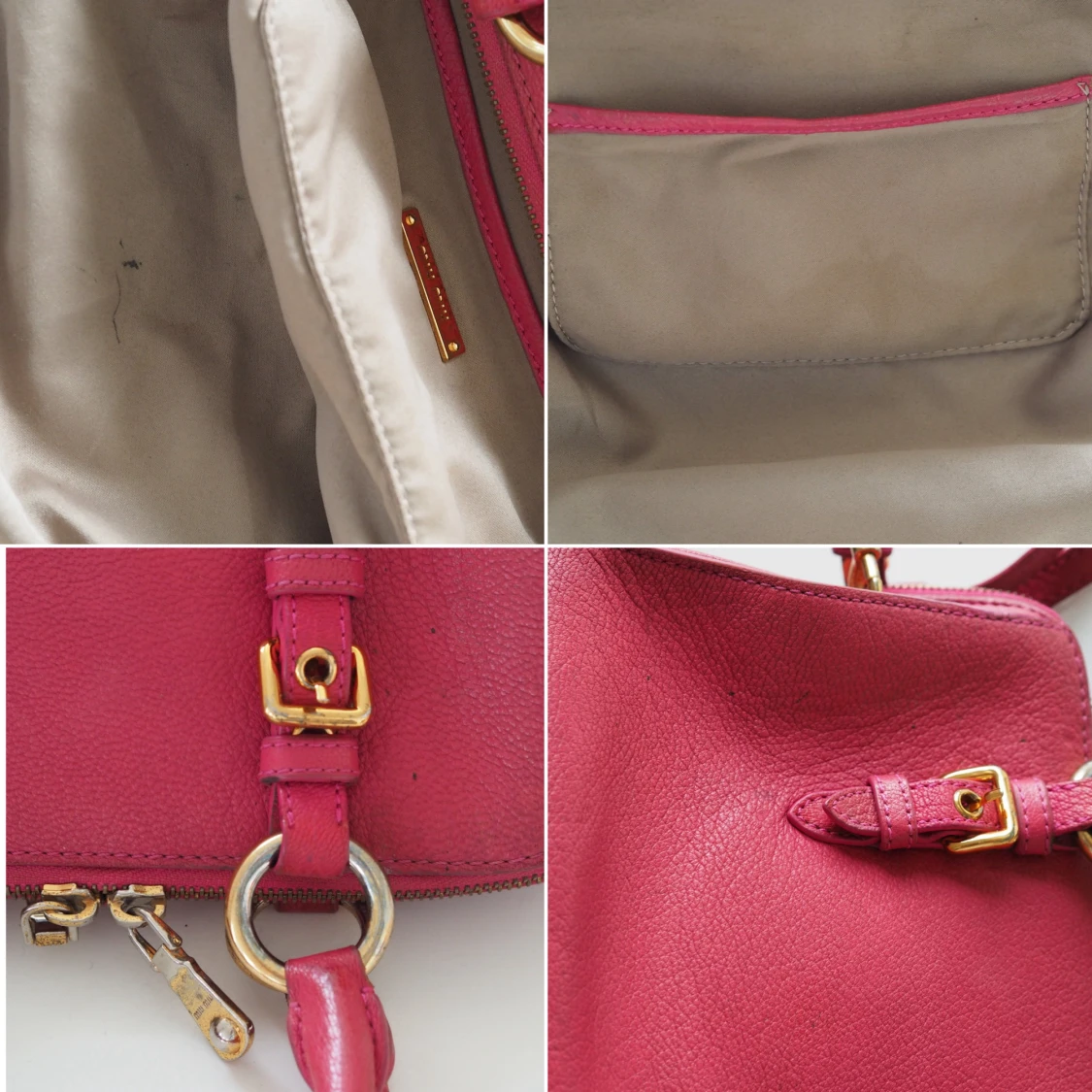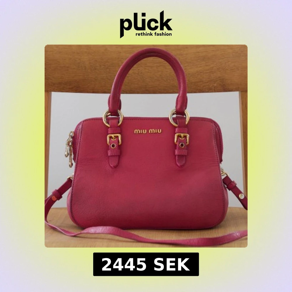 Snygg rosa handväska från Miu Miu i äkta skinn med guldfärgade metalldetaljer och dubbla handtag. Väskan har justerbar axelrem, dragkedja upptill och flera innerfack. Perfekt för dig som vill ha en stilren och lyxig accessoar med statement-känsla.