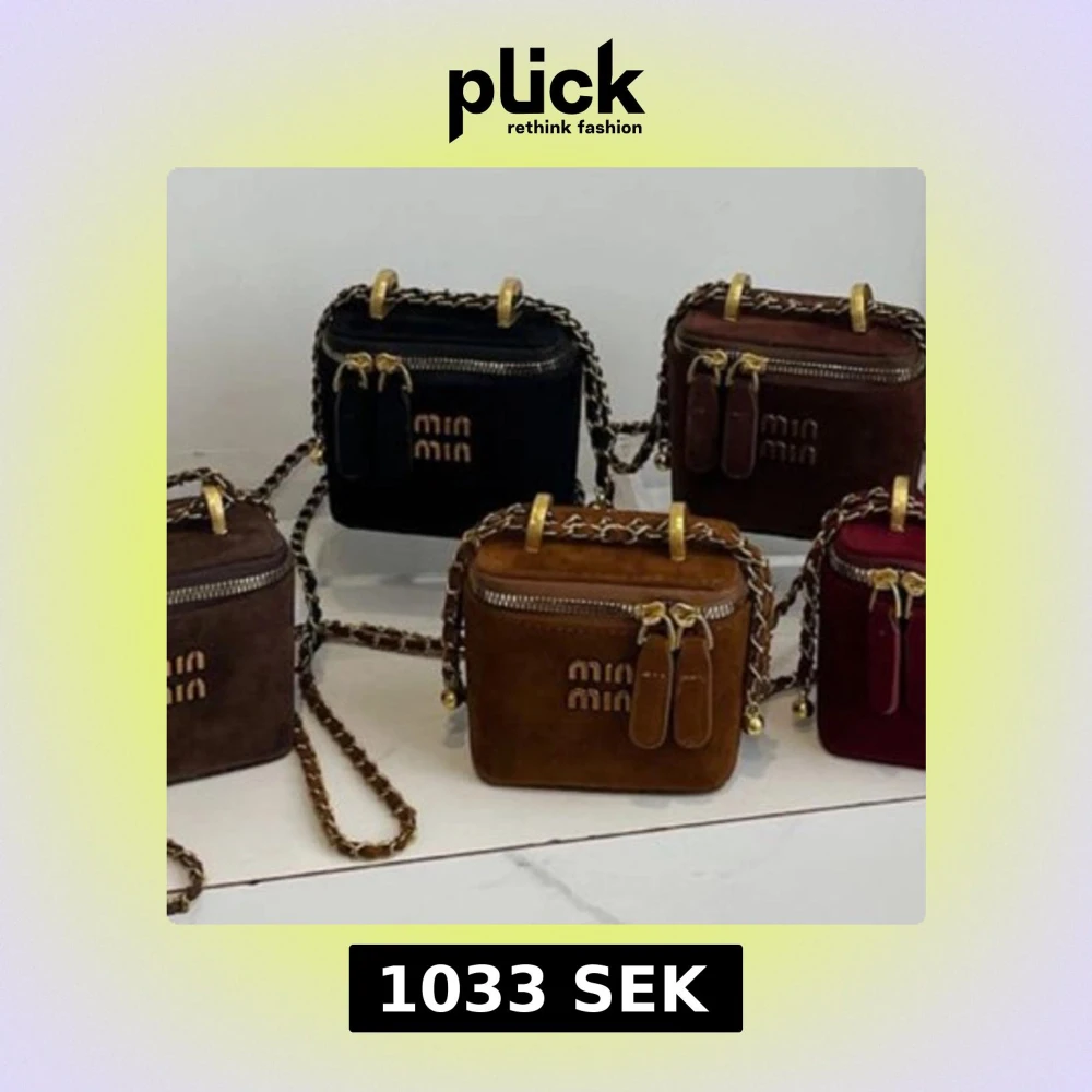 Säljer flera snygga axelväskor från Miu Miu i mocka med guldfärgade detaljer och kedjeaxelrem. Väskorna finns i svart, brun, mörkbrun och vinröd. De har dragkedja upptill och Miu Miu-logga framtill. Perfekt storlek för det viktigaste.