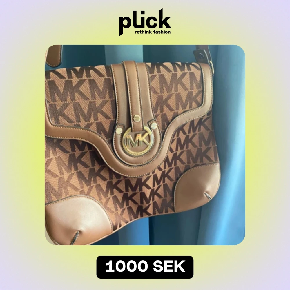 Säljer en snygg brun axelväska från Michael Kors. Väskan har ett mönster med MK-loggan över hela ytan och detaljer i brunt skinn. Den har en praktisk dragkedja och ett stort fack inuti med flera mindre fack för förvaring. Perfekt för både vardag och fest!
