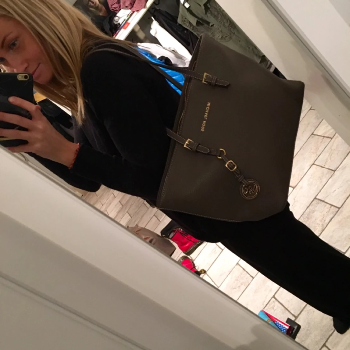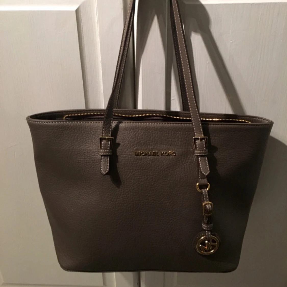 MK väska. Liten och brun/grå. Guldiga detaljer. 250 kr. Tar swish!