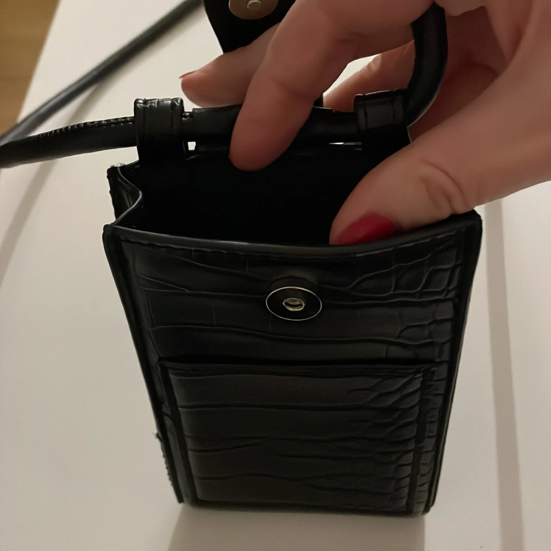 Mobilhållare/mobilväska. Plats för en mobiltelefon o kort o läppglans. Höjd 14 cm, bredd: 9 cm o ca 3 cm djup. 1 litet ytterfack. Inga fler fack inuti utan bara för mobilen o något mer småt typ kort/nyckel/läppglans