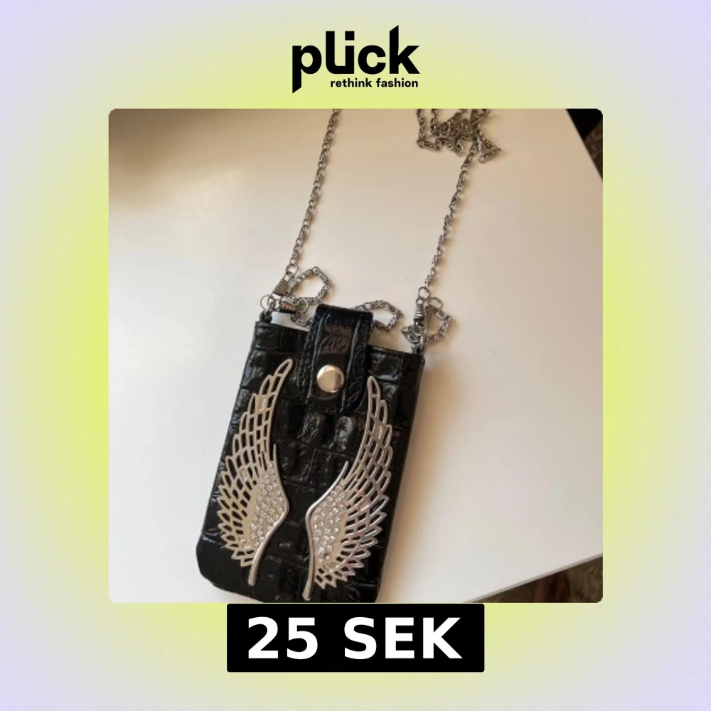 Cool svart mobilväska i croc-mönstrat skinnimitation med silverfärgade vingar och strass framtill. Väskan har en lång kedjerem och stängs med magnet knapp. Perfekt för att lyfta din outfit med edgy detaljer.