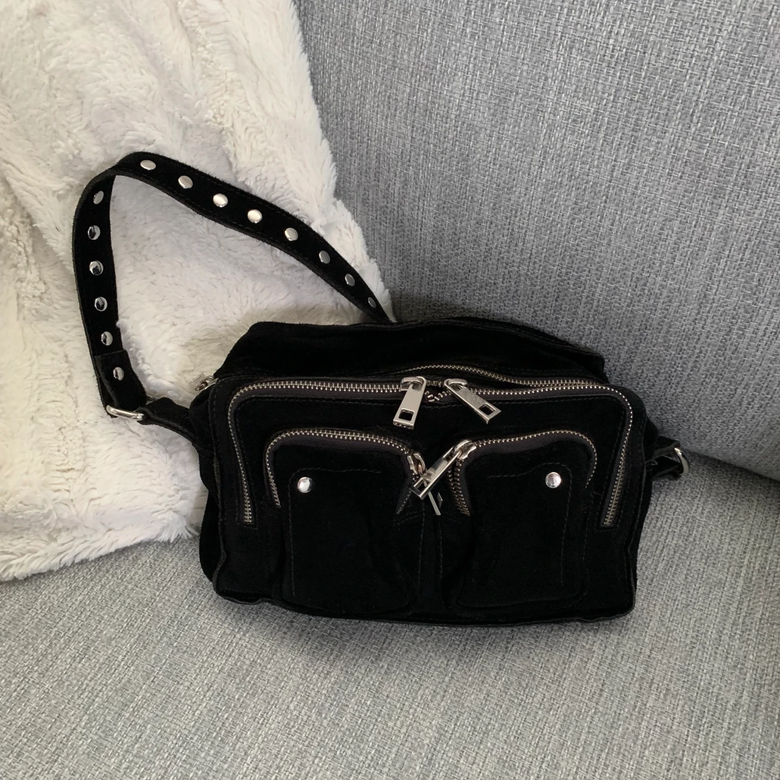 Säljer mina núnoo väska som knappt blivit använd. Snygg väska i svart med nitar. Köpt på zalando för 1495kr. Skicket är precis som nytt. Säljer för 600kr. Bandet till väskan medföljer och har aldrig blivit utplockat ur förpackningen. Skickas spårbart!
