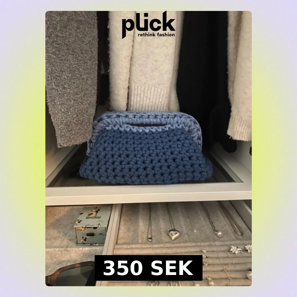 Säljer en superfin handväska i virkad design, gjord i ljusblått/mörkblått second hand t-SHIRT garn från massindustrin. Väskan har en mjuk, rektangulär form och ett praktiskt handtag upptill (20cm). Perfekt för att bära småsaker i och ger en unik touch till din outfit, oavsett om du ska till skolan eller ut på stan!