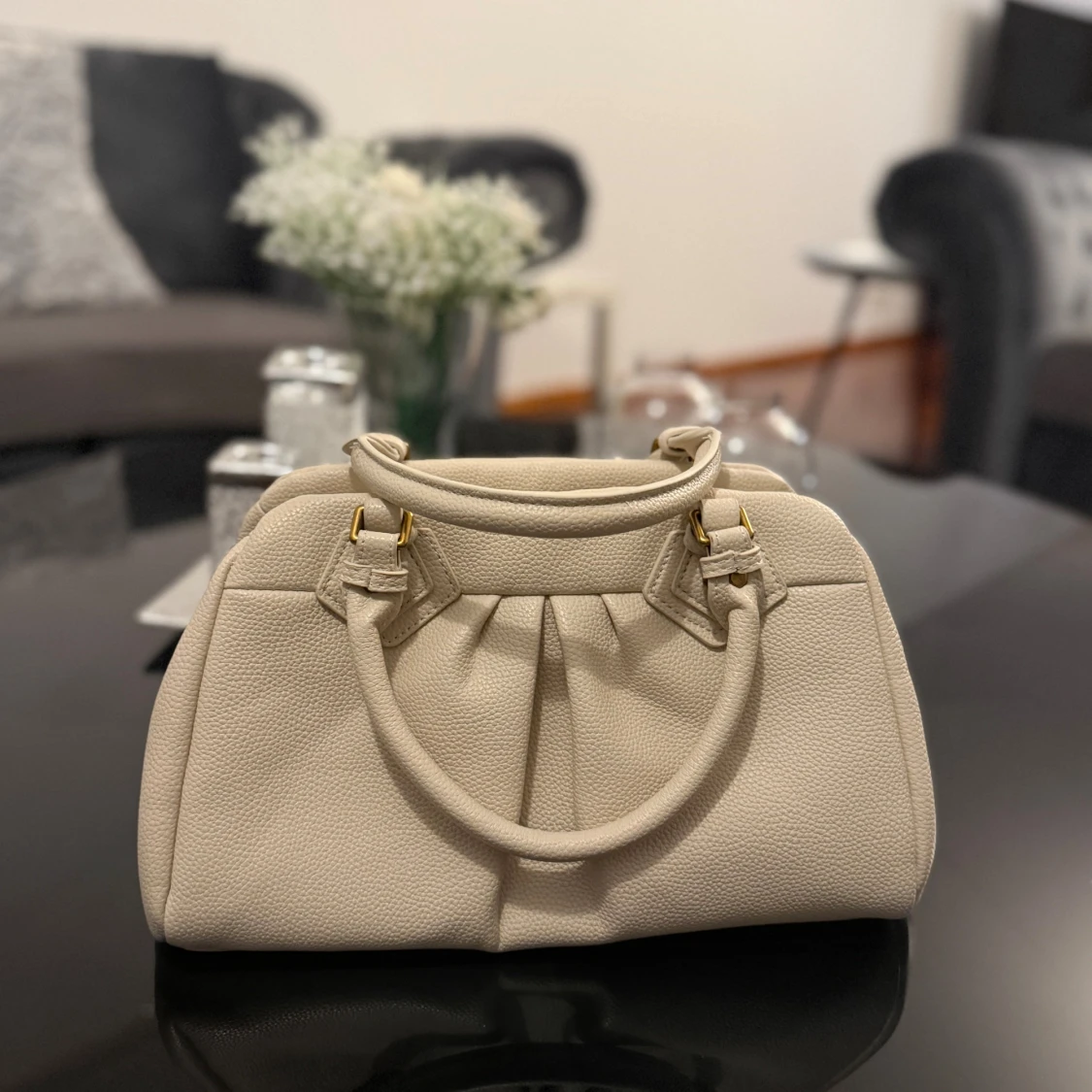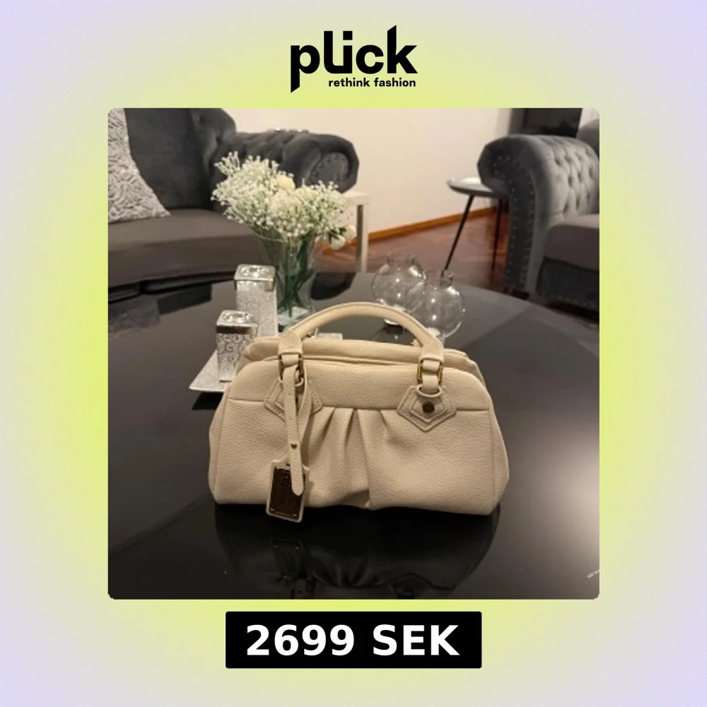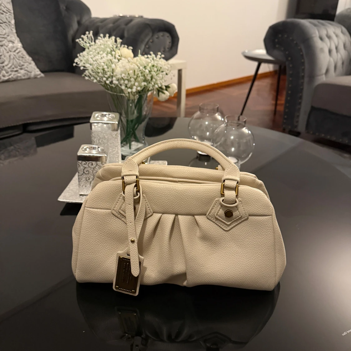 Snygg beige handväska från Marc by Marc Jacobs med guldfärgade metalldetaljer och klassisk tag. Väskan har rundad form, dubbla handtag och är tillverkad i strukturerat skinn. Perfekt storlek för det viktigaste och stilren design.